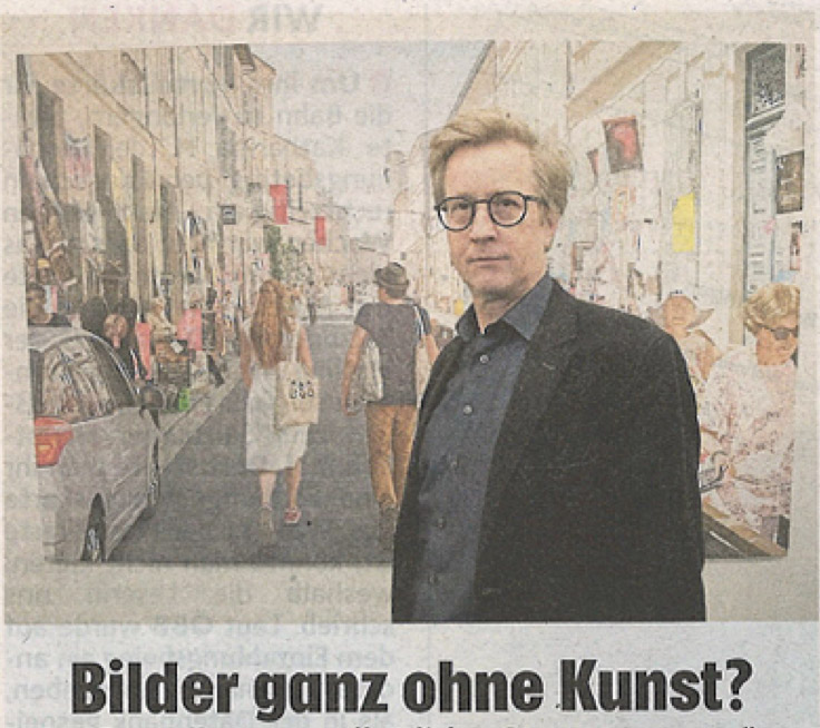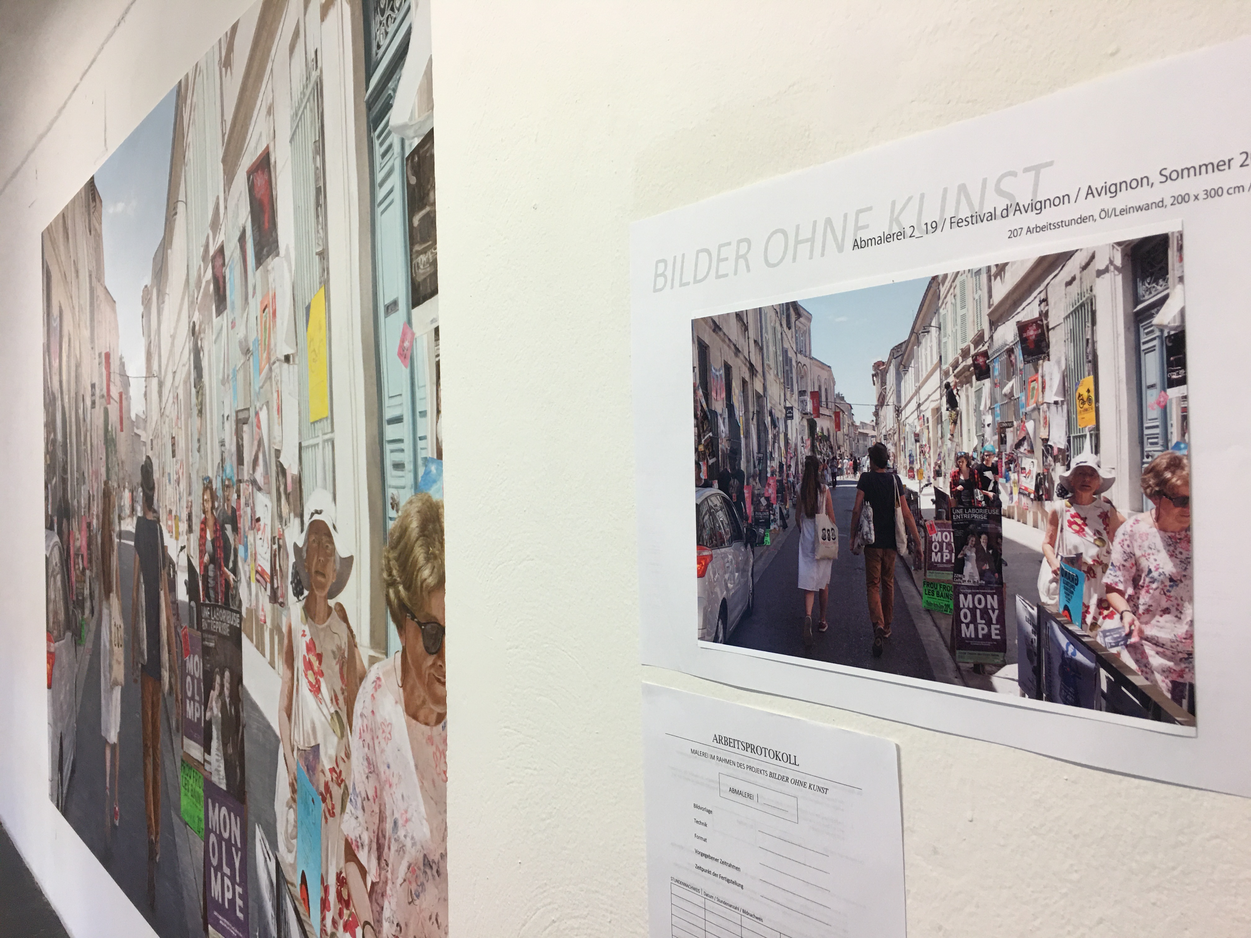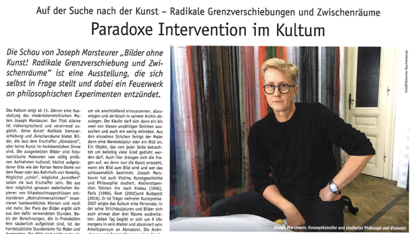 Joseph Marsteurer geht es bei BILDER oder KUNST vor allem um Zwischenräume. In dieser Arbeit (der Abmalerei) „grenze ich vielmehr ab, es sind eben nicht die ästhetischen Räume, die in der anderen Arbeit, die ich sonst mache, ständig zum Zentrum werden.“ Marsteurer schließt hier etwas – seine Malerei als Kunst – aus: Indem er aber ausschließt, grenzt er den Begriff ein. „Dazu muss es aber relativ kunstnah sein für eine breite Betrachterschaft. Mit diesem Ausschlussverfahren ist der Fokus, wo sich Kunst-Ästhetisches abspielt, enger, etwas exakter.“