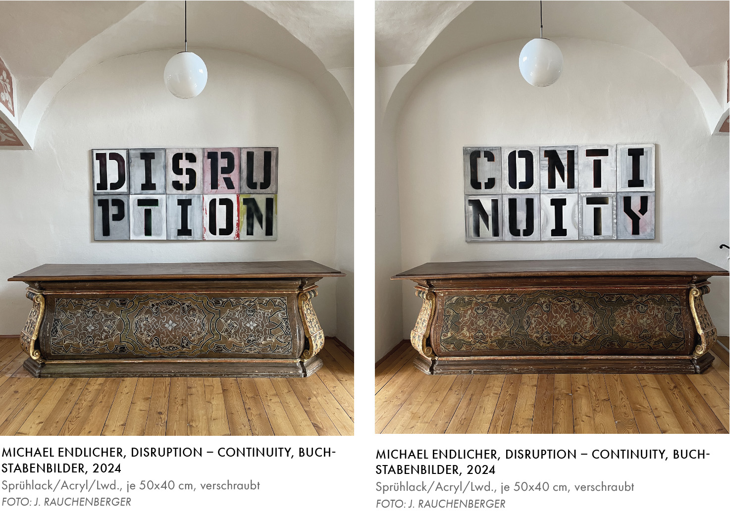 Man kann dort die Mystik all dieser Dramen von Gott, Welt und Existenz studieren: Dazwischen spannt sich die Ausstellung, die mit „01“ und „AZ“ bereits im Arkadengang beginnt und im traditionellen Stiegenhaus (Stiege Süd) zwischen dem zweiten und ersten Stock über den historischen Speisesaaltischen des Minoritensaals mit der Aufschrift „CONTINUITY“ und „DISRUPTION“ endet, auf einem sehr großen Ausstellungsareal auf.
