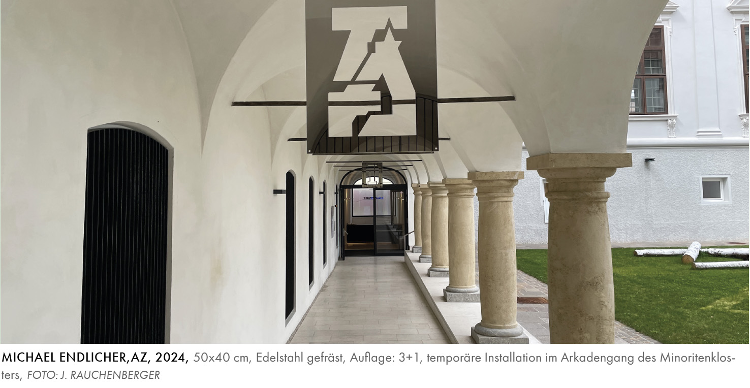 Michael Endlicher stellt in seiner Kunst allgemeine Fragen. Sie sind existenzieller Natur, ebenso aber gesellschaftlicher und politischer. Um ganz von vorne noch einmal anzufangen: Eine Brise eines Windzugs im Arkadengang im Hof vor dem Minoritensaal lässt die beiden gefrästen Metalltafeln mit ihren ausgeschnittenem „01“ und „AZ“ höchst lebendig werden.