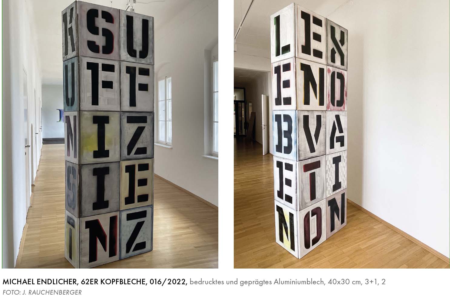 Die Faszination des Künstlers für seine beweglichen Lettern als Bilder führte ihn auch in Drei-Dimensionalität. Bildertürme entstanden schließlich, einer ist auch im Südgang des 2. Stocks zu sehen: Der „EXNOVATION“ (Ausstiegsprozesse aus nicht-nachhaltigen Strukturen im Gegensatz zur INNOVATION) auf der einen Seite steht die „SUFFIZIENZ“ (das richtige Maß im Gegensatz zur Effizienz) auf der anderen Seite gegenüber; auf den Schmalseiten hinterfragen LEBEN und KUNST einen vermeintlichen (?) Gegensatz.