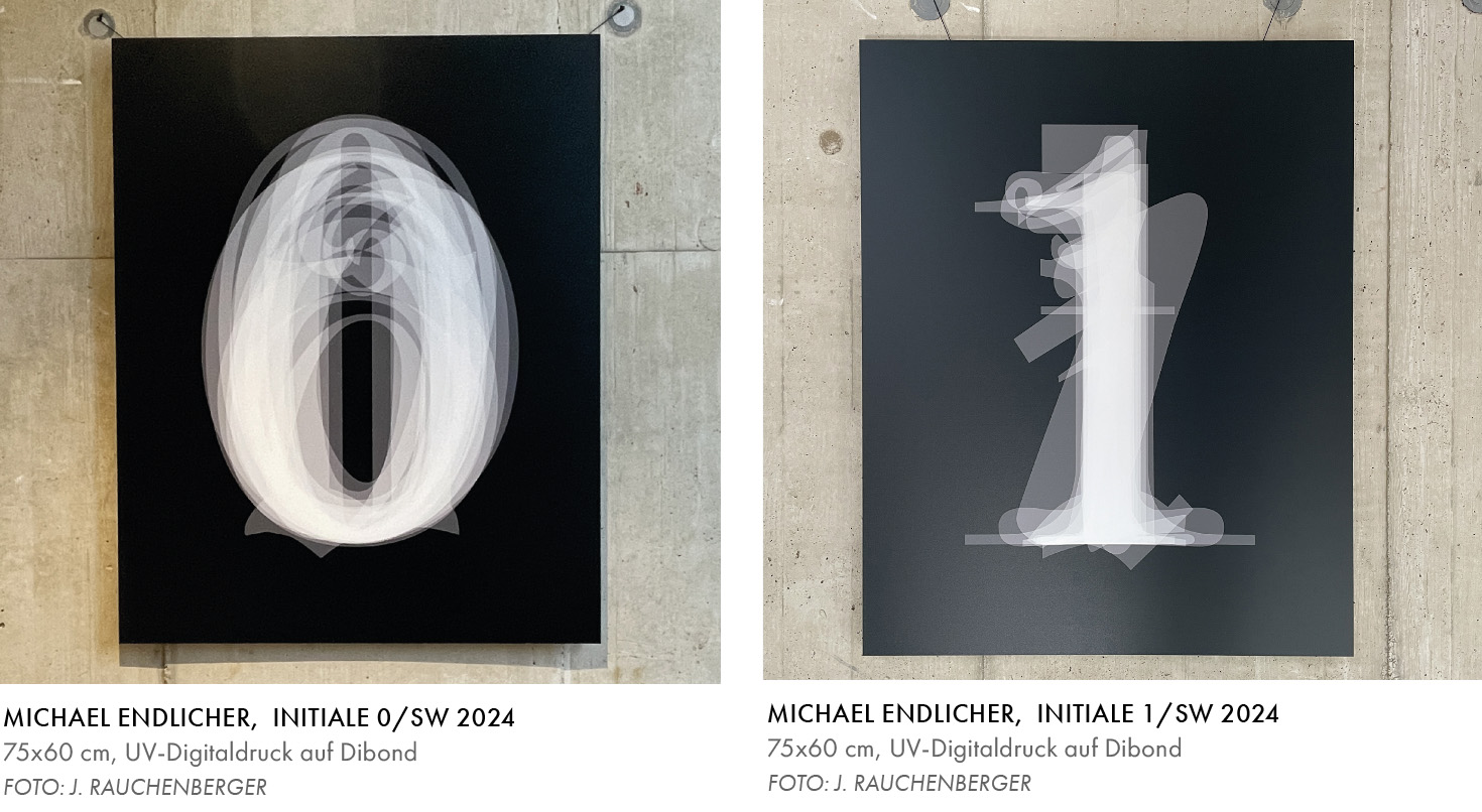 „Z“ ist auch das Ausstellungssujet. Es erinnert an Röntgenbilder. Michael Endlicher, Sohn eines Schriftsetzers, hat sich über die Jahrzehnte mit unterschiedlichsten Schriftschnitten beschäftigt. Hier hat er alle möglichen „Z“ übereinandergelegt und sie so einer sprichwörtlichen „Durchleuchtung“ unterzogen. In der Ausstellung werden noch Variationen von „A“ (gleich zu Beginn vor der Stiege), von „0“ und „1“ (an den Sichtbetonfronten der jeweiligen Stiegenläufe in den entsprechenden Geschoßen) folgen. Zu durchleuchten, durch die Oberflächen hindurch, nicht nur zu verdichten, ist Endlichers grundsätzliche Strategie, wenn er Kunst macht.