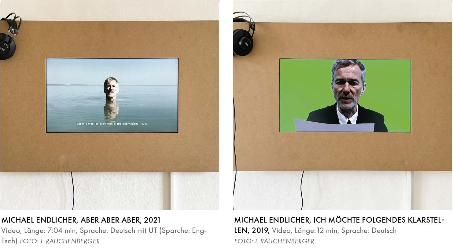 Zwei davon werden in der Mittelzelle der Ausstellungszellen im 2. Stock präsentiert. „Aber aber aber“ zeigt den Künstler, fast versunken im Neusiedlersee, wie er stellvertretend für seine Betrachterinnen und Betrachter alle möglichen Argumente vorbringt, das Leben angesichts des drohenden Klimakollapses doch nicht zu ändern… Und bei „Ich möchte Folgendes klarstellen“ entschuldigt er sich als Nachrichtensprecher (in einer synchronisierten Frauenstimme) bei allen möglichen Gesellschaftssegmenten und distanziert sich von ihnen – political correctness sozusagen auf die Spitze getrieben, die uns jeden Atem nimmt.