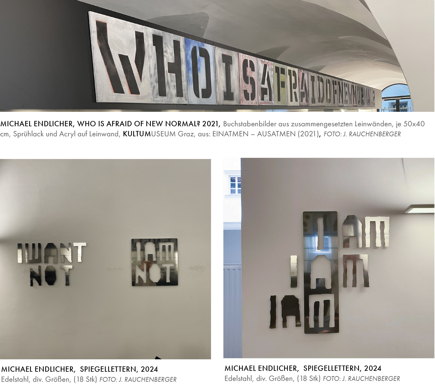 So arbeitet Michael Endlicher, wenn er ortsspezifisch arbeitet und seine Ausstellungen konzipiert, von denen mitunter oft mehr bleiben sollte, als nicht selten geblieben ist: Das gilt vor allem für seine raumgreifenden Sprachbilder, die er mit Schablonenschrift sprayt und sie dann mit ganz realen Buchstabenbildern kombiniert. Aus letzteren baut er je neue Sätze, orts- und zeitabhängig: Bevor er sein „WHO IS AFRAID OF NEW NORMAL?“ im Netz teilte, schrieb er – in den ersten Tagen des Lockdowns in der Corona-Pandemie im März 2020, als die kollektive Existenzangst wirklich groß war, schlicht „STAYING ALIVE“ mit seinen neuen Buchstabenbildern, mit denen er fortan künstlerisch hantierte und entsprechende Sätze baute.