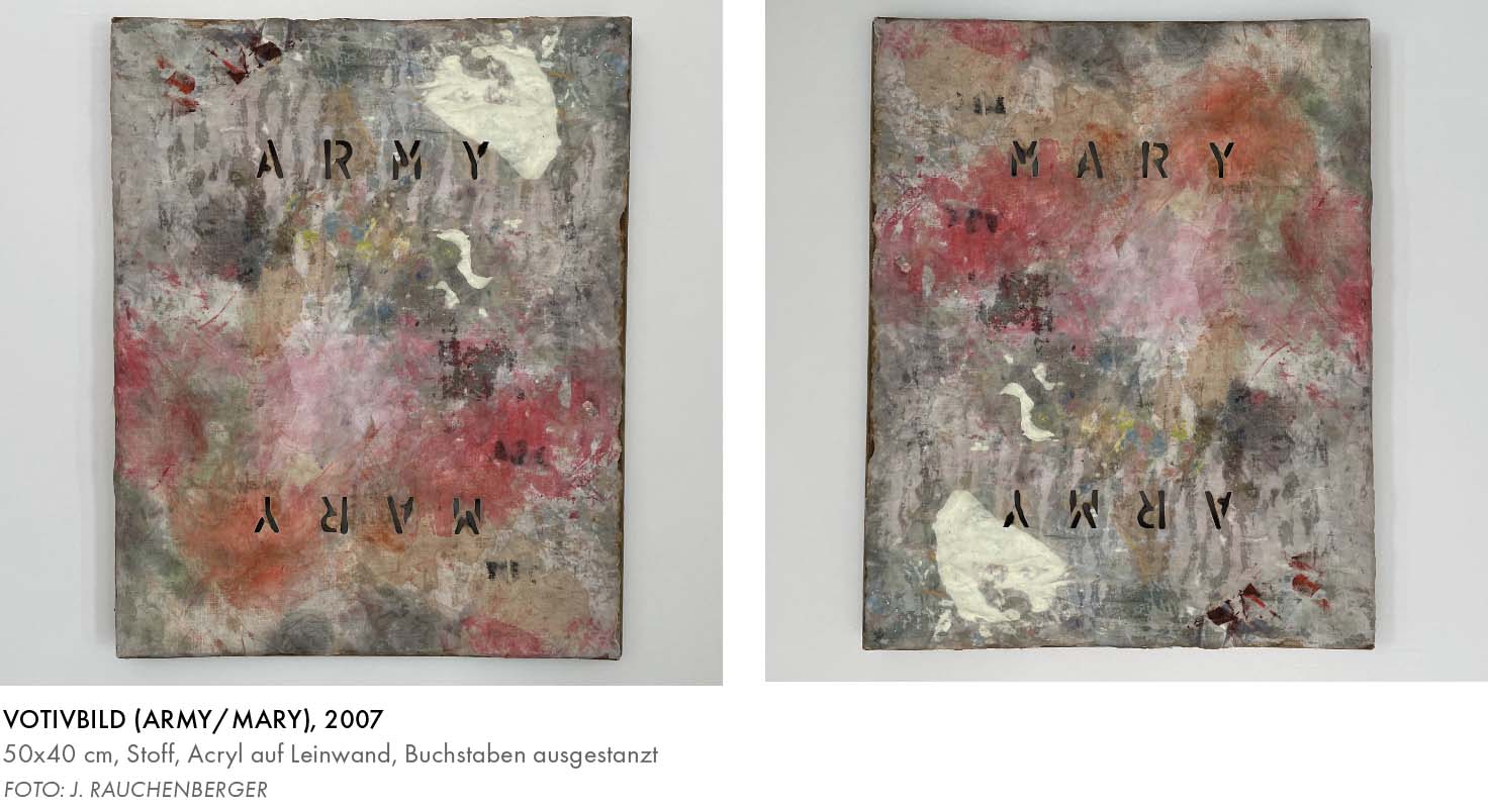 Über einen Ausstellungweg von drei Stockwerken hinweg sind weitere Videos Endlichers in dieser Schau gesetzt, die sich mit gemalten Bildern, geprinteten Lettern, gestanzten Dramenblechen oder gefrästen Buchstaben abwechseln: Eines davon, ganz unscheinbar an der Ecke von „HERZMARY“ angebracht, ist das ebenfalls umzudrehende Bild „MARY“, dessen Buchstaben der Künstler zu „ARMY“ verschoben hat. (Das „Mariahilf-Bild“ galt nicht zuletzt in der Zeit der Türkenkriege auch als Siegesbanner.)