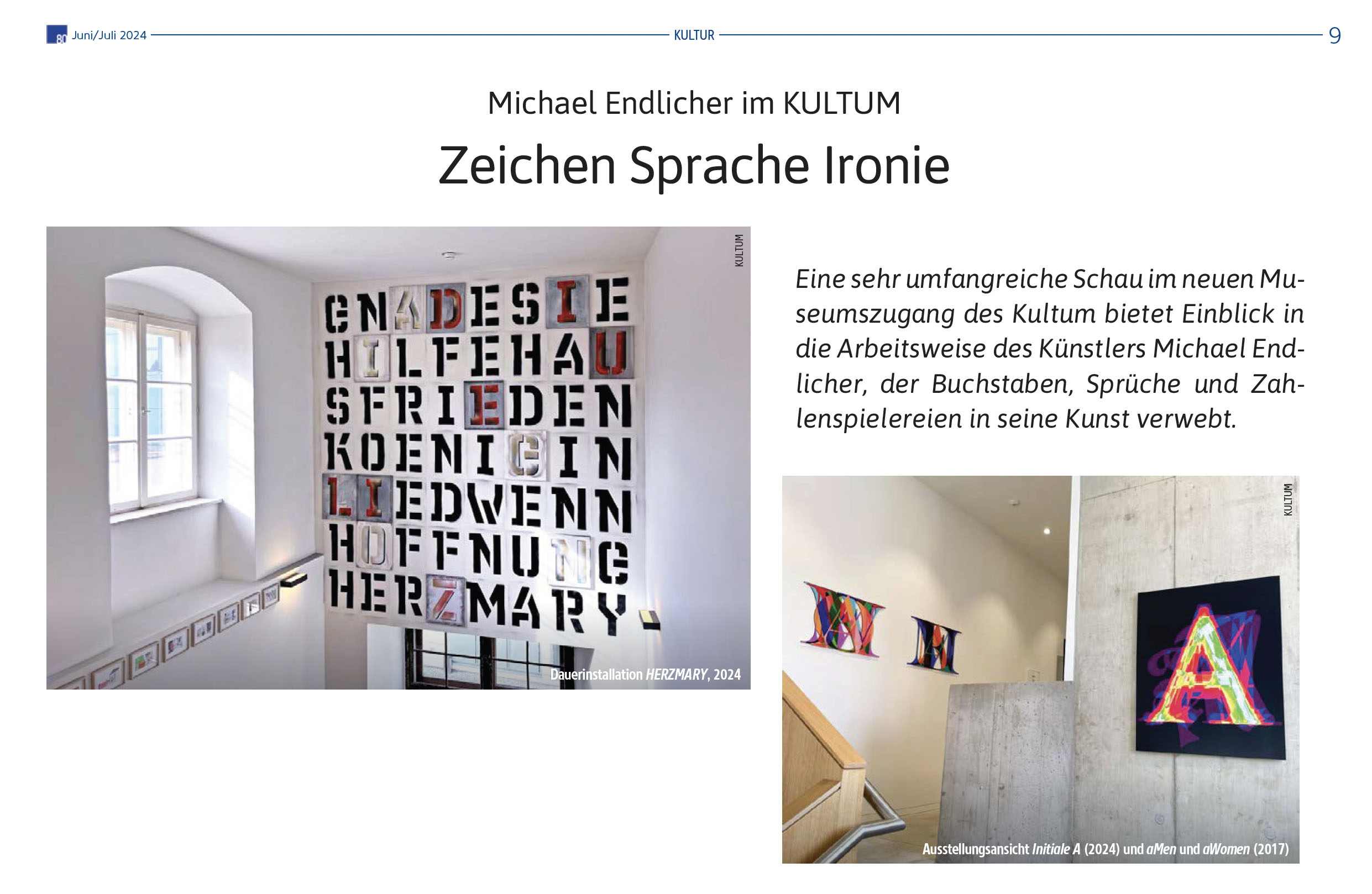 Für das Minoritenzentrum gestaltete er für diese Ausstellung die hohe, zwei Stockwerke umfassende Westwand des neuen Stiegenhauses mit dem Titel: „HERZMARY“. Sie wird Teil eines neuen Museumszugangs und interpretiert den Ort „Mariahilf“ neu: Die Arbeit kondensiert mit exakt 56 Einzelbuchstaben ein altes Wallfahrtslied dieses Ortes und setzt dabei den gesprayten Buchstaben. die die Greundebene bilden, zwei „Fremdworte“ als reale Buchstabenbilder entgegen. Das eine ist selbstredend in Gold, das andere in Rot gehalten: Die mittelalterliche Mystikerin Hildegard von Bingen (1098-1179) hatte ein seltsames Glossar erfundener Wörter – mehr als 1000 – in einer eigenen Geheimsprache geschaffen. Jene für „Gott“ und „Teufel“ lauten: „AIGONZ“ und „DIJELIZ“ – treffen sich in jenem Buchstaben, der nicht nur in dieser Ausstellung eine wichtige Rolle spielt: dem Z. Die Installation endet jedenfalls im Gleichklang mit der Intention des Ursprungstextes: HoffnungHerzMary.