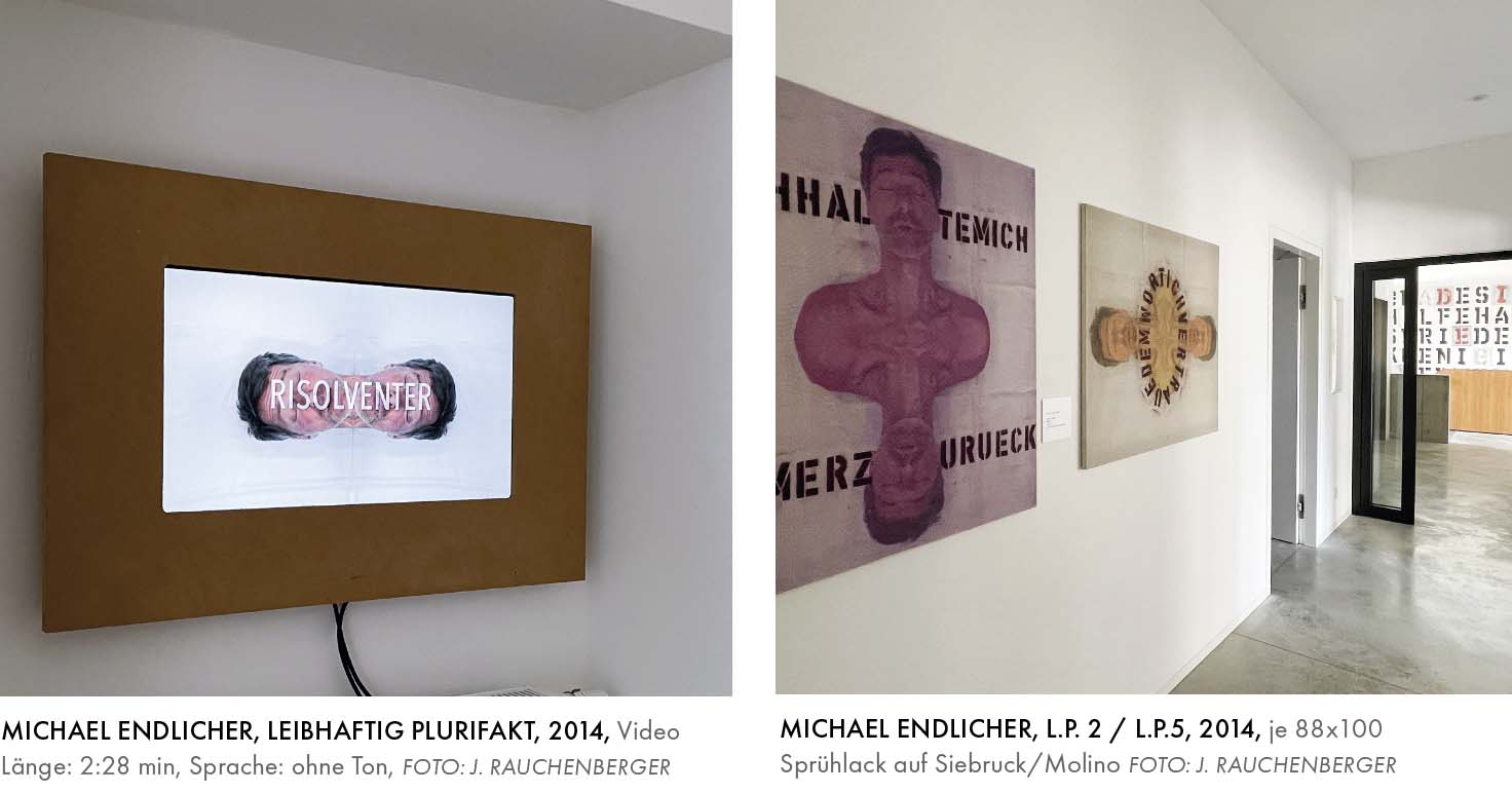 Auffällig in Endlichers künstlerischem Erkunden von Sprache, Bild und Bedeutung ist seine Nähe zu religiösen Sprachspielen oder auch -diskursen, die sich über Jahre vor allem in der Thematisierung von Litanei-ähnlicher Sprache manifestierte. Aber auch das Medium Bild als solches wird auf der Basis religiöser Bildgeschichte reflektiert. So lautet eine Inschrift auf einem frühen Bild (2001) aus dieser Ausstellung: „WENN DIE KUNST FRÜHER ASKESE ODER DAS LEIDEN CHRISTI UND DER CHRISTLICHEN MÄRTYRER GEZEIGT HAT, SO WIRD DANK DER AVANTGARDE DIESES BILD SELBST ASKETISCH UND LEIDET UNTER ALLEN MÖGLICHEN VERUNSTALTUNGEN, VERUNREINIGUNGEN UND BLESSUREN. ES WIRD JETZT SELBST ALS KÖRPER VERSTANDEN, DER LEIDET – UND NICHT MEHR NUR ALS BLOSSES UND GLEICHGÜLTIGES MITTEL, UM FREMDE LEIDEN DARZUSTELLEN.“