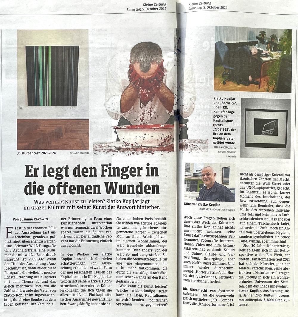 At a time of deeply felt crises and new wars, the work of Croatian artist Zlatko Kopljar is an artistic example of an ethical and aesthetic (re)orientation: Kopljar explores the lasting after-effects of the traumas of the 20th century for the present day and subjects them to artistic transformation. In co-production with steirischer herbst ‘24, the KULTUMUSEUM Graz is showing a retrospective of the artist's work spanning a period of 30 years.