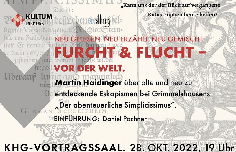 Die Sorge um das eigene Seelenheil in einer gefallenen Welt bringt den Protagonisten und „seltsamen Vaganten“ in Grimmelshausens Simplicissimus zur Zeit des Dreißigjährigen Kriegs dazu, ihr als Einsiedler zu entfliehen. Brauchen wir auch heute bestimmte Formen der Weltflucht, um die Hiobsbotschaften der Moderne auszuhalten? Welche Rolle spielen Medien in der Vermittlung apokalyptischer Weltbilder? Mit dem Journalisten Martin Haidinger ging Moderator Daniel Pachner im Rahmen unserer Diskursreihe NEU GELESEN. NEU ERZÄHLT. NEU GEMISCHT. solchen Fragen nach. Die differenzierenten, auch lebensbejahenden Antworten Haidingers („Solange der Mensch ein strebendes Wesen ist, kann die Welt nicht ganz schlecht sein“) im Rahmen der Relecture dieses aufgrund des Ukraine-Kriegs gerade ziemlich aktuellen Schelmenromans können im Veranstaltungsbericht nachgelesen werden.