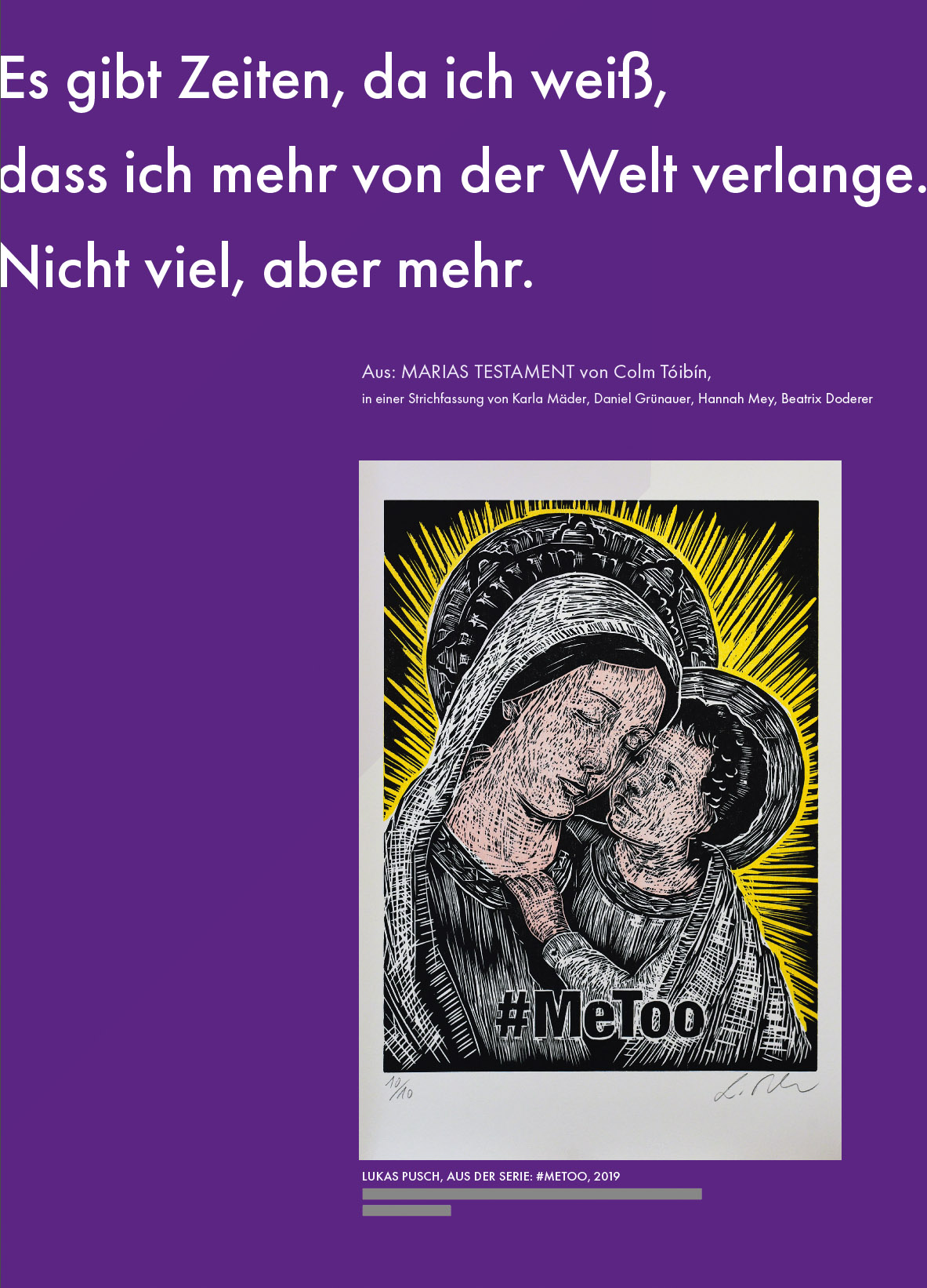 In der unübersichtlichen politischen und religiösen Situation im Nahen Osten am Beginn unserer Zeitrechnung entstand etwas Neues mit transformatorischer Kraft: das Christentum. Aus heutiger Sicht erscheint es mit seinem Gründer Jesus Christus wie ein patriarchales Erfolgsmodell, das sich bis in die letzten Winkel der Erde verbreitet hat. Doch was wäre, wenn plötzlich die Mutter des am Kreuz geopferten Gottes-Sohnes als Mensch aus Fleisch und Blut vor uns stünde? Sie war doch dabei, als alles geschah! Diese Frau, millionenfach auf Bildern abgebildet, wird von zwei Milliarden Gläubigen verehrt. Aber wo ist ihre ureigene Stimme? Die von ihr in der Bibel überlieferten Worte sind wenige. Der irische Autor Colm Tóibín holt sie gleichsam vom geschichtlichen Altar herunter auf den Boden der irdischen Tatsachen und lässt sie reden ... Er konstruiert ein fiktionales Marienbild aus tausend Gefühlen: Mutterliebe, Wut, Trotz, Angst, Verzweiflung – und Scham.
