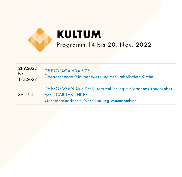 Am kommenden Samstag, den 19. November findet (diesmal) um 17 Uhr eine weitere öffentliche Kuratorenführung durch die Ausstellung DE PROPAGANDA FIDE statt. Der Schwerpunkt ist – am Tag der Heiligen Elisabeth – die Caritas mit ihren Plakaten und Öffentlichkeitsauftritten der letzten 70 Jahre. Als Gast darf ich die eben zur Vizepräsidentin der Caritas Österreich gewählte steirische Caritas-Direktorin Nora Tödtling-Musenbichlerwillkommen heißen. Vorigen Samstag war das Künstlerpaar Künstlerpaar zweintopf (Eva Pichler und Gerhard Pichler) zu Gast: Am hochinteressanten Gespräch vor ihrer Installation können Sie auch im Nachhinein über die Aufzeichnung teilnehmen.