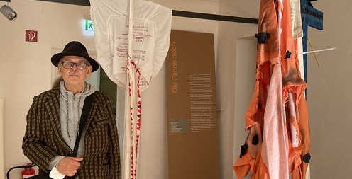All diese Aspekte schwingen in den Fahnen von Hannes Priesch, der am 3. Dezember Gesprächspartner in der Kuratorenführung von Johannes Rauchenberger ist, mit. Er erinnert an die Fahnenkultur von Politik und Religion, deren Geschichte ein ganz spezielles „graphic design“ aufweist und als solches künstlerisch inszeniert wird. Priesch hat ein tiefes Misstrauen in gewaltsame Formierungen eines „Wir-Gefühls“, das er gerade in der ausgeprägten Fahnenkultur von Gemeinschaften sieht: In ihr entfacht die religiös-patriotische, die identitätsstiftende, aber eben auch abgrenzende Haltung ihre jeweiligen Energien.