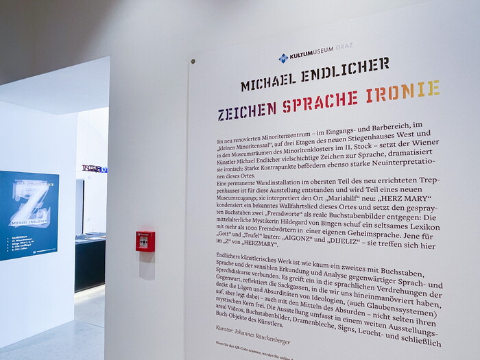 Michael Endlicher, der Künstler, der Sprache, deren Buchstaben und dann wiederum deren möglichen Sinn seismographisch künstlerisch bearbeitet, hat sich in der am Samstag zu Ende gehenden Ausstellung ZEICHEN SPRACHE IRONIE in einem großen Werk, das einen neuen Museumszugang für die Ausstellungsräume im 2. Stock bildet, mit dem Mythos dieses Ortes auseinandergesetzt: Nicht Minoriten, sondern "Mariahilf" interpretiert er mit einem großen Wandbild neu, kondensiert ein diesen Ort mitprägendes Wallfahrtslied (das "Mariahilferlied"), sprayt Worte daraus auf die Wand und legt mit den Bildkörpern ganz realer Bilder zwei "Fremdwörter" drüber: AIGONZ und DIUELIZ – das sind zwei der über 1000 Worte umfassenden Glossarkorpus der mittelalterlichen Mystikerin Hildegard von Bingen (Benedikt XVI. hat sie vor ein paar Jahren sogar zur Kirchenlehrerin erhoben, das ist der höchste Titel den man in der kath. Kirche verleiht): Sie bedeuteten: GOTT und TEUFEL. (Das Z verbindet sie in der Variante des Küntlers).