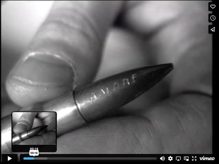 LOVE SHOT (1996): Kopljar graviert das Wort für "Liebe" in Kroatisch, Englisch und Italienisch auf ein Projektil. Er fährt zu einem bewaldeten Hügel in der Nähe von Zagreb, wo das Publikum und seine Waffe auf ihn warten. Der Künstler lädt die Waffe und feuert sie blind in die Nacht.