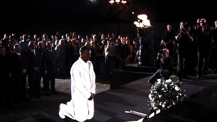 Immediately afterwards, in the small Minoritensaal, Willi Brandt kneels in front of the Warsaw Ghetto Memorial - in the form of the light figure by artist Zlatko Kopljar (K15).