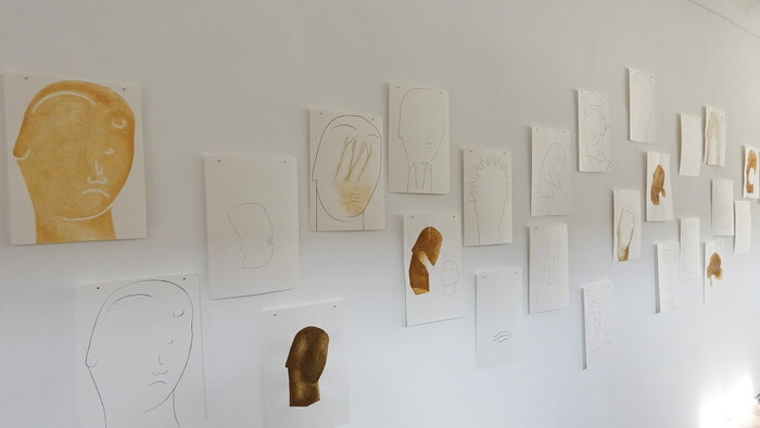 Lena Knilli, Kirchengrundriss und Becken, 2010–2012 (Serie), Transparentpapier auf Karton, Klebestreifen, 59,5 x 43 cm, KULTUMUSEUM Graz, aus: Seelenwäsche (2013), Ausstellungsansicht: GOTT HAT KEIN MUSEUM. Aspekte von Religion in Kunst der Gegenwart (2025)