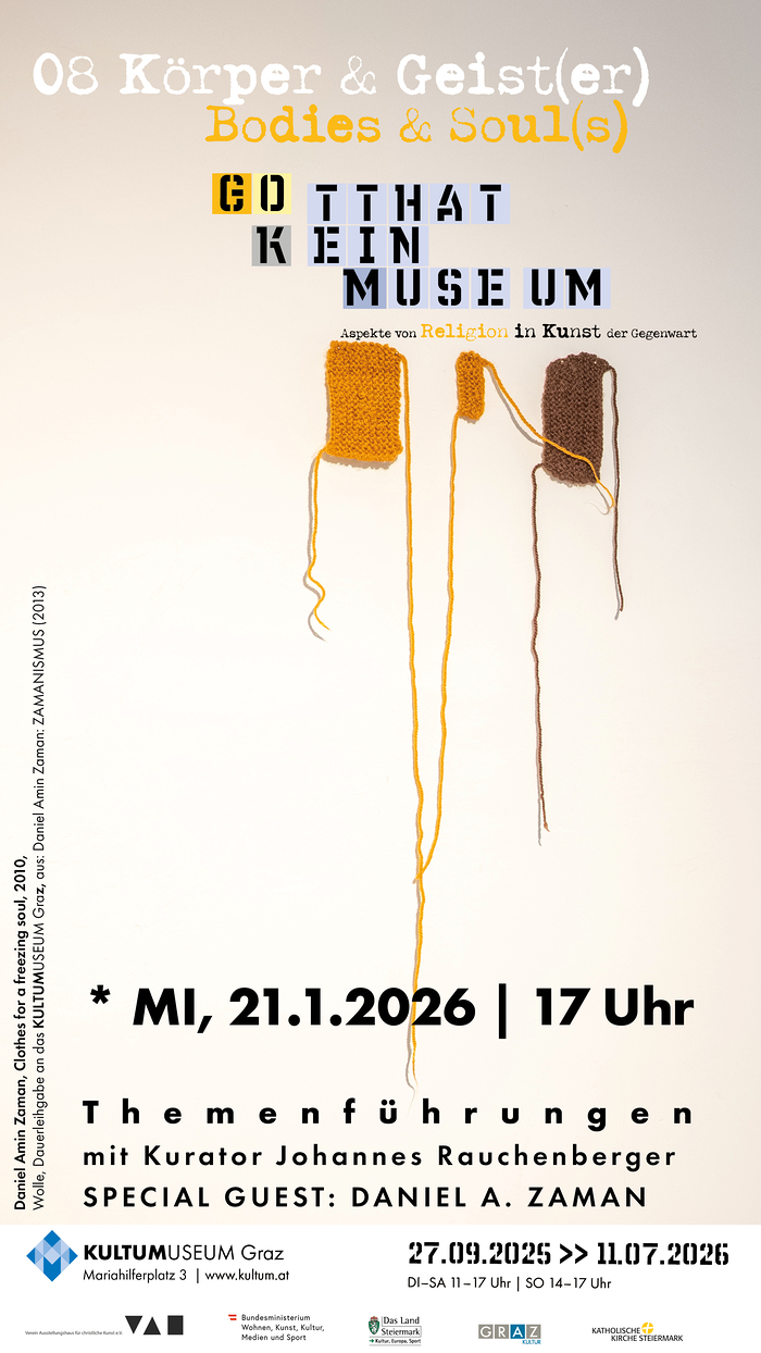 Nach der intensiven Führung mit Jochen Höller vorletzten Samstag und der Abschlussführung Gerhard Lojen im Spiegelgitterhaus am letzten Samstag geht es am Mittwoch, 21. Jänner 2026, 17 Uhr mit der 9. Themenführung in der Ausstellung "GOTT HAT KEIN MUSEUM" weiter: Der Wiener Künstler Daniel A. Zaman ist special guest zu einer weiteren Führung von "Bodies & Souls". Er ist in unserem Haus kein Unbekannter, seinen "Zamanismus" stellten wir vor vielen Jahren vor. Er, der so intensive Affinitäten zu kultischen Handlungen hat, strickte dabei "Clothes for a freezing soul"; im Lockdown im Zuge der Corona Pandemie umwickelte er wochenlang Seile mit tiefblauer Farbe. Zu hören ist der Atem, die Atempause.