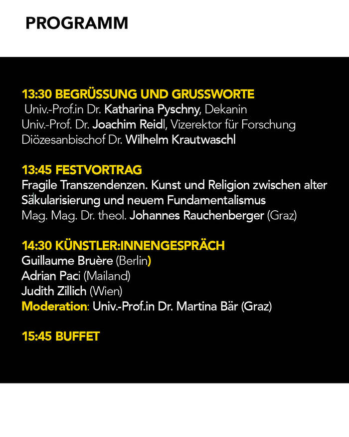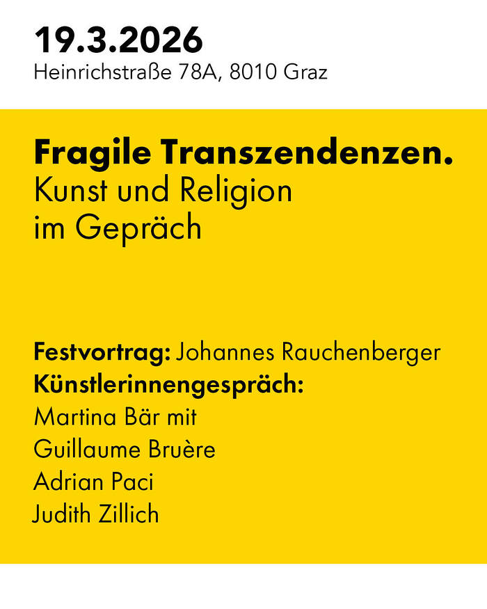 In einer Zeit, in der Religion zum "Medium" geworden ist, und politisch zudem vereinnahmt wird, sind Transzendenzen umso fragiler geworden - aber anders als in Form der Bestreitung, wie sie aus der Aufklärung hervorgegangen ist: Gerade deshalb braucht es Orte, an denen sie reflektiert, befragt und neu zur Sprache gebracht werden. Die Katholisch-Theologische Fakultät der Universität Graz unterstreicht mit ihren Kooperationspartnern ihren Anspruch, gesellschaftliche Entwicklungen theologisch zu deuten – und im Dialog mit der Kunst neue Perspektiven auf Glauben und Gegenwart zu eröffnen.