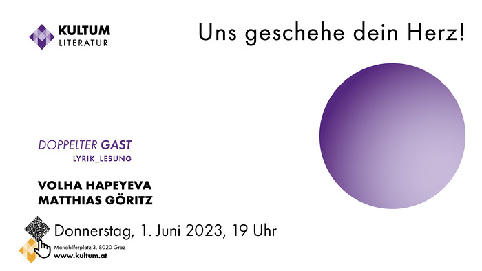 Herzlich laden wir Sie zum nächsten Abend der Lyrik-Reihe: "DOPPELTER GAST" am 1. Juni ein, in der Volha Hapeyeva und Matthias Göritz im KULTUM zu Gast sein werden. Einführung und Gespräch teilen sich an diesem Abend Barbara Rauchenberger und Andreas Unterweger (Literaturzeitschrift manuskripte).