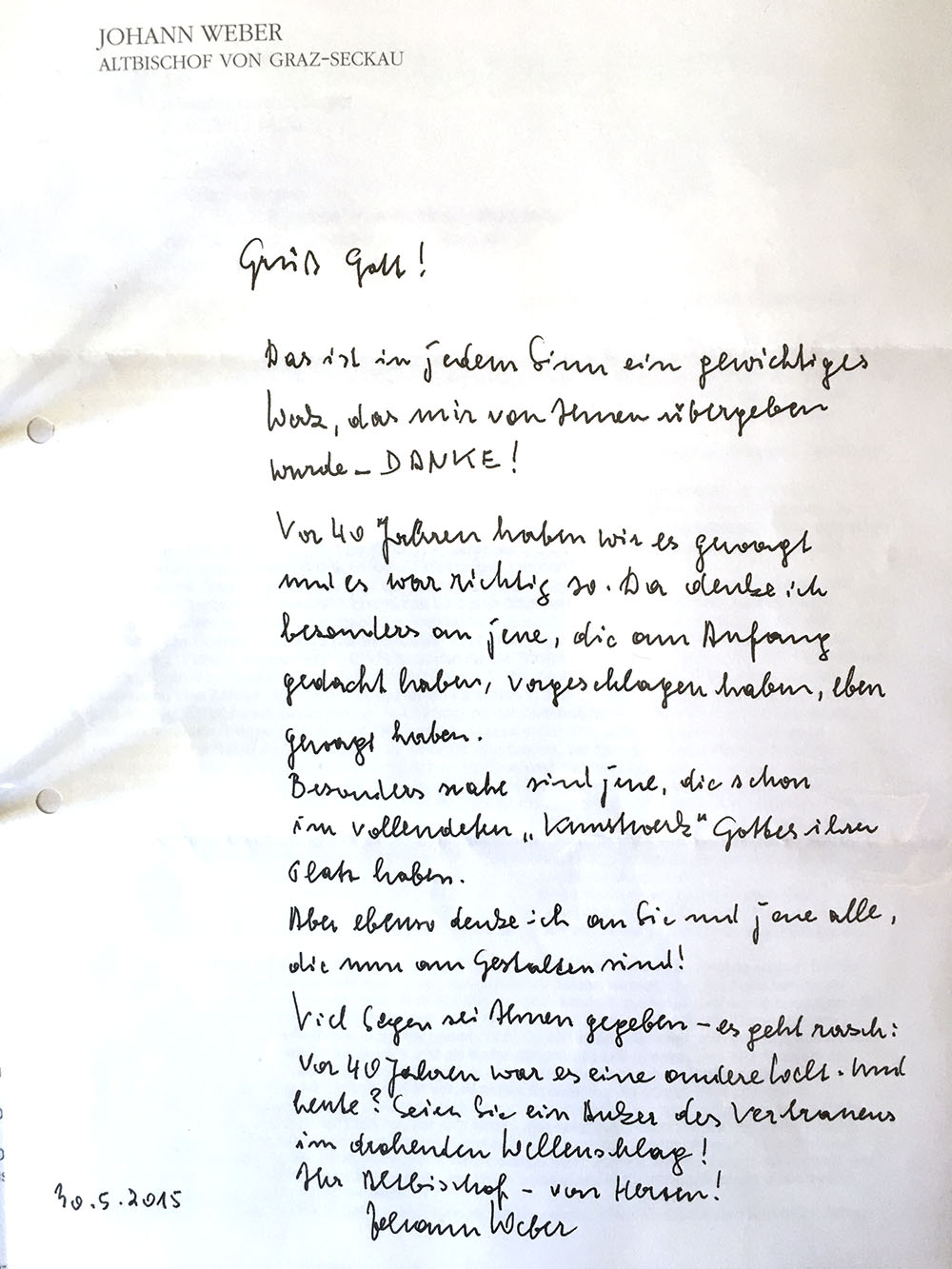 Brief von Altbischof Johann Weber an Johannes Rauchenberger zum 40. Geburtstag des Kulturzentrums im Jahr 2015