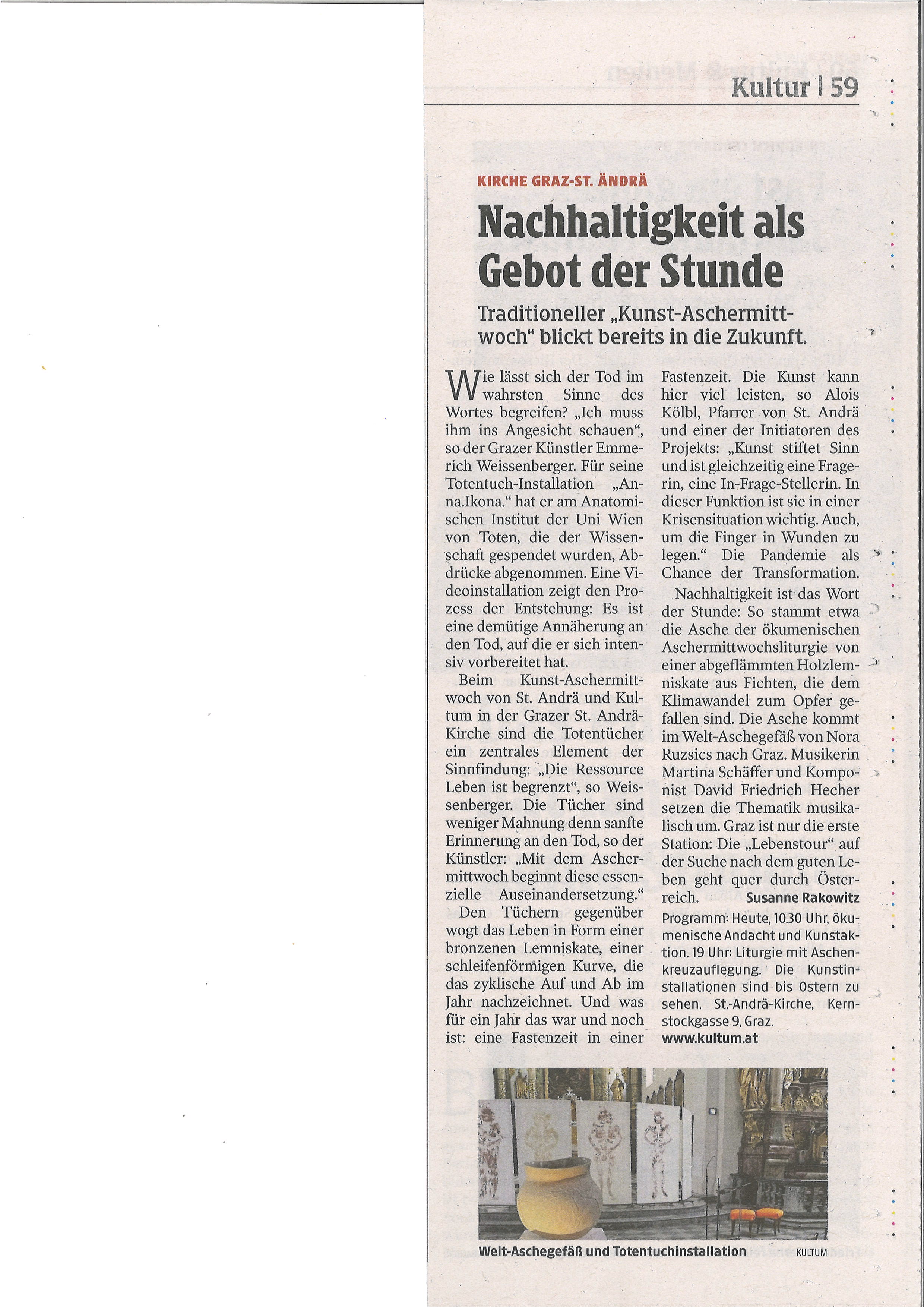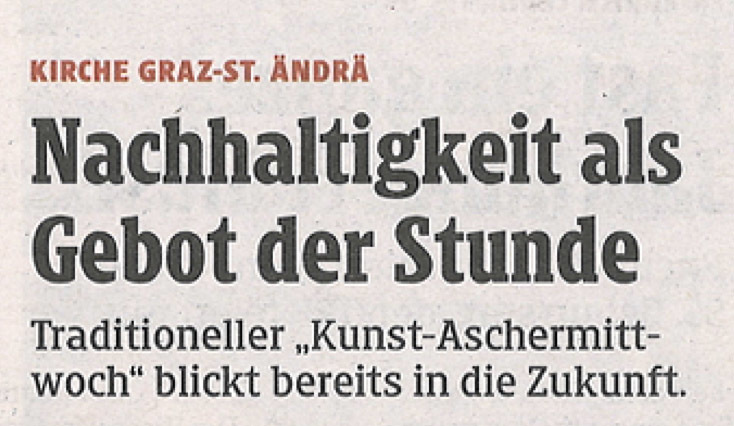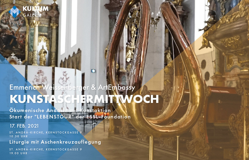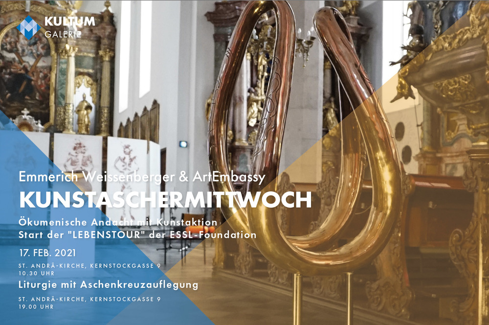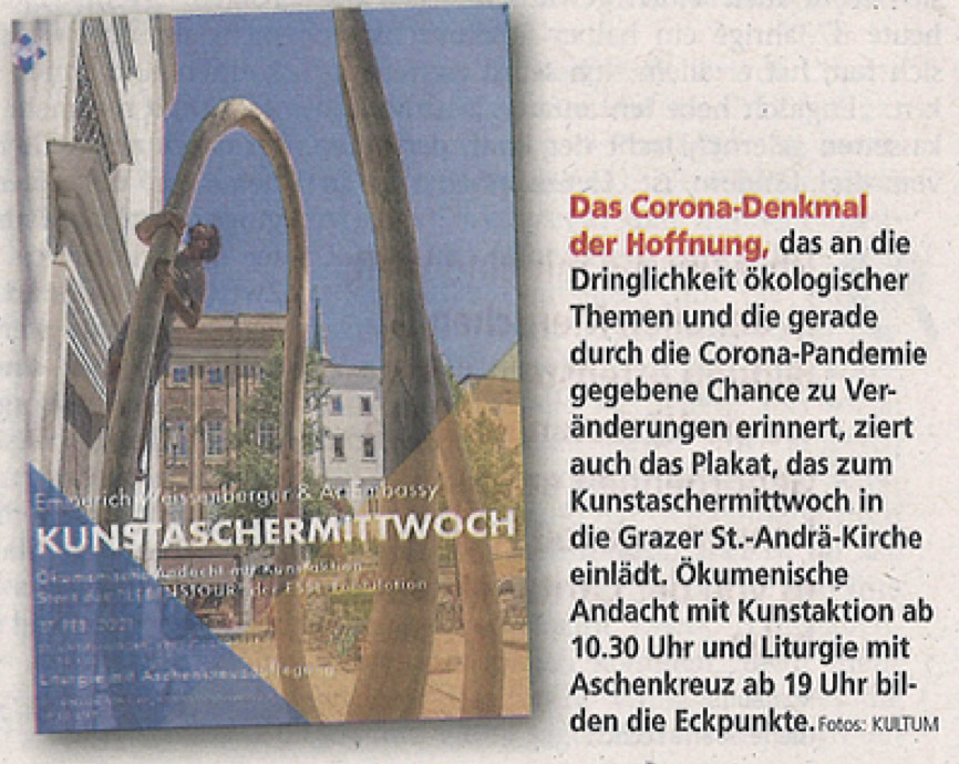 Die Corona-Pandemie beschleunigt krisenhafte Entwicklungen und macht Problemzonen gesellschaftlichen Handelns sichtbar. Die "Lebenstour durch Österreich" will sie als Chance der Weiterentwicklung und Transformation begreifen. Der Kunst-Aschermittwoch 2021 in Graz-St. Andrä ist der Startpunkt. Die Krise positiv zu nutzen, ist erklärtes Ziel aller, die an der Aktion und ökumenischen Feier teilnehmen. Brücken bilden und Hoffnung geben wollen Pfarrer Alois Kölbl und sein evangelischer Kollege Matthias Weigold (Heilandskirche). Die Asche der ökumenischen Aschermittwochsliturgie in St. Andrä stammt von der abgeflammten und geschwärzten Oberfläche der großen Holz-Lemniskate von Emmerich Weissenberger.