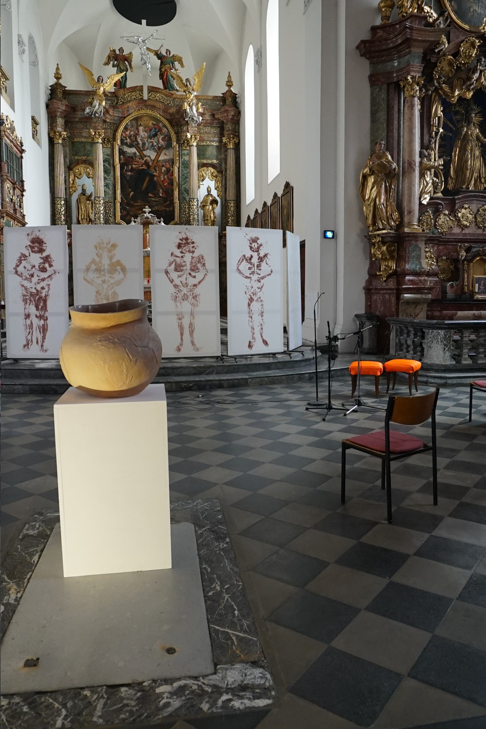 Die Asche kommt im Welt-Aschegefäß von Nora Ruzsics nach Graz. So vereint die Kunstaktion die Ur-Lemniskate aus Bronze mit der Totentuch-Installation Anna.Ikona und der musikalischen Uraufführung Hechers. In einem performativen Malakt wird im Rahmen der Liturgie das erste von sieben Siegel-Bildern von Emmerich Weissenberger entstehen.