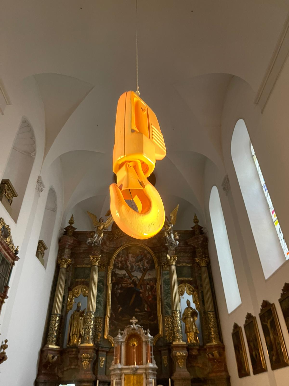 Manfred Erjautz schreibt dazu: "Ich habe gestern zwei Aschermittwoch-Skulpturen aufgebaut. Die eine, "The human hook", ein fast freischwebender Kranhaken, befindet sich oberhalb des Altars und beschäftigt sich mit Stresssituationen, in denen man mehr zu leisten vermag, auf die Dauer gesehen aber schädlich ist. Der Kran, der den Haken in den Kirchenraum hängt, ist jenes Werkzeug, das u.a. Kirchen entstehen ließ, bleibt aber unsichtbar.