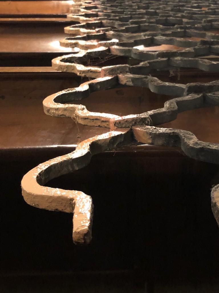 Manfred Erjautz: Barockes Gitter, 2010 aus der Grazer St. Andrä-Kirche entwendet. 24. Februar 2022 bemalt und horizontal auf die Kirchenbänke installiert.