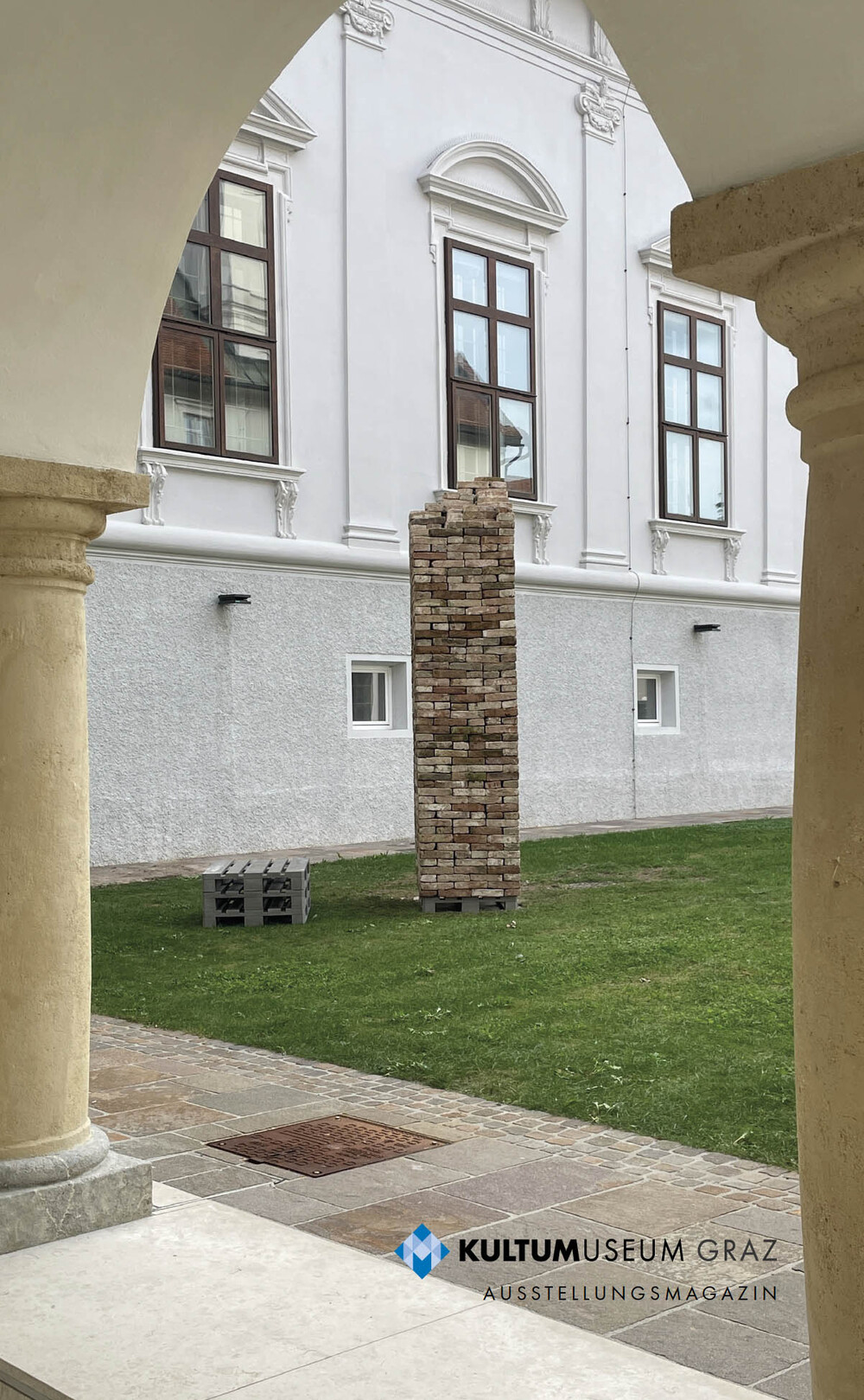 Der Ziegelturm im Hof vor dem Minoritensaal ist eine der 22 „Konstruktionen“ des kroatischen Künstlers Zlatko Kopljar, der im KULTUM im steirischen herbst 24 auf drei Etagen ausgestellt wird. Ausgelöscht sind längst die Hersteller dieser Ziegel. Ausgelöscht ist vielfach auch die Erinnerung, gegen die sich der Künstler zur Wehr setzt: Es breitet sich dabei ein künstlerisches Werk aus fast vier Jahrzehnten aus, die die Frage nach der Rolle der Kunst in einer heutigen Gesellschaft stellt, die bedrohlich an ihren Fundamenten des Zusammenlebens sägt: Kopljars Werk setzt sich mit den Themen Schuld und Opfer nach der Erfahrung des Krieges auseinander, mit Werten in einer postkommunistischen und einer kapitalistischen Gesellschaft, mit Ethik und vor allem mit der Sehnsucht nach Orientierung. Transzendenz, Erhabenheit und Rituale spielen dabei eine große Rolle. Der Künstler setzt sich gegen Auslöschung dieser Themen vielfach zuwehr.