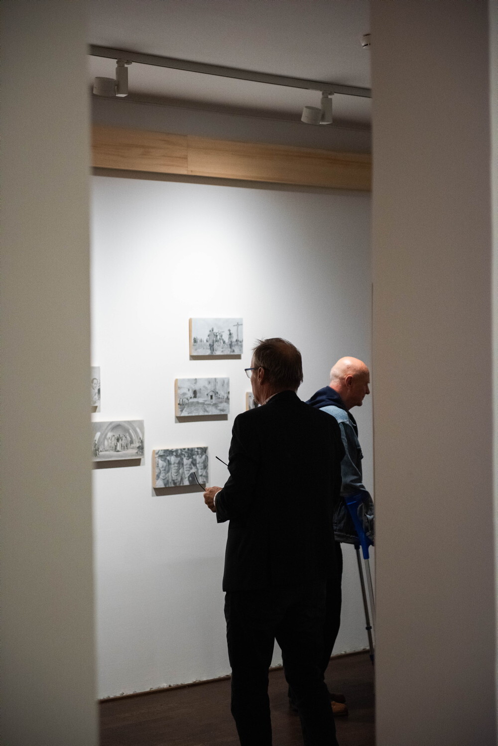 Lena Knilli, Kirchengrundriss und Becken, 2010–2012 (Serie), Transparentpapier auf Karton, Klebestreifen, 59,5 x 43 cm, KULTUMUSEUM Graz, aus: Seelenwäsche (2013), Ausstellungsansicht: GOTT HAT KEIN MUSEUM. Aspekte von Religion in Kunst der Gegenwart (2025)