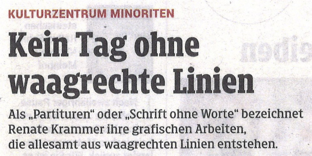 Renate Krammers Linien rücken Urelemente der Gestaltung ins Zentrum. Sie werden in unzähligen Variationen der Formen und Beziehungen zueinander in Spannung versetzt. Vibrationsräume entstehen. Eine Struktur wird sichtbar – als Partitur, als Schrift, als Schwingungsraum. Die Lebendigkeit von Krammers „Strichen“ lassen die Intimität ihrer Entstehung erahnen.