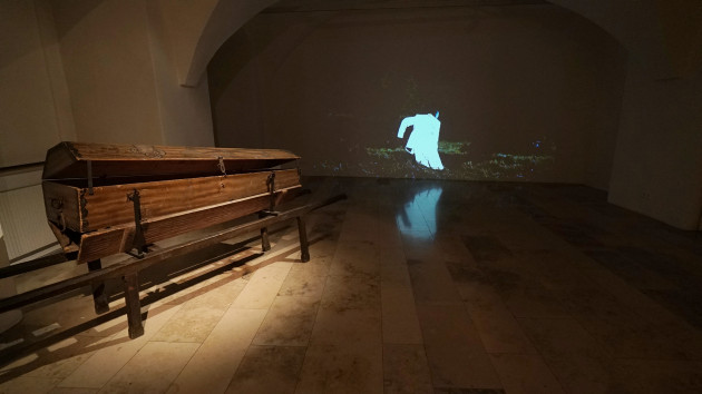 Der zweite Raum besinnt sich mit einem einmaligen Ausstellungsstück auf ein zweites großes Narrativ der Geschichte dieser Kirche: Die Aufklärung. Sie hat in Österreich die Gestalt des aufgeklärten Absolutismus. Das heißt: Sie wird weitgehend vom Kaiser bzw. der Regentin verordnet. Ihre kirchenkritische Seite erlebt die Kirche dieses Landes vor allem in der Aufhebung von Klöstern und der Abschaffung des kirchlichen Prunks sowie des Wallfahrtswesens. Kaiser Joseph II. (1741 – 1790) hinterlässt Spuren im Religionsgedächtnis der Steiermark wie wohl kein zweiter – obwohl er von 1780 bis 1790 nur 10 Jahre Zeit für sein Reformwerk hat. Das Positive zuerst: Das Toleranzedikt von 1791 beendet die fast 200-jährige Verfolgung der Protestanten. In der Steiermark versetzt der Kaiser (!) 1786 den Bischofssitz nach Graz; nachdem er das Stift Seckau aufgehoben hat, hebt er in den folgenden Jahren noch weitere 18 Klöster in der Steiermark auf, verbietet Wallfahrten, gibt starre Regeln für den Gottesdienst vor, lässt die Votivbilder verbrennen, geht gegen den Wunderglauben vor, zieht Kirchengut ein und gründet dafür Schulen, Waisenhäuser, Krankenhäuser – Kirche soll nützlich und sparsam sein, kurz: sie soll kostenoptimiert agieren. Viele seiner Haltungen erinnern an heute. Beim „Sparsarg“[26]für Beerdigungen geht er offenbar zu weit, dieser hält sich nur rund fünf Jahre. Aufklärung hat etwas mit Erhellung und mit Licht zu tun. Dieser Klappsarg trifft auf eine zeitgenössische Videoinstallation: Eine Lichtfigur schaufelt sich in diesem Raum ein Loch (ein Grab?) in die Erde. Zlatko Kopljarseindrucksvolle Arbeit „K 16“ lässt den Gedanken der Aufklärung vielfach schimmern.[27]Graben sich die Lichtfiguren selbst ein Grab? Verschwinden sie immer mehr?