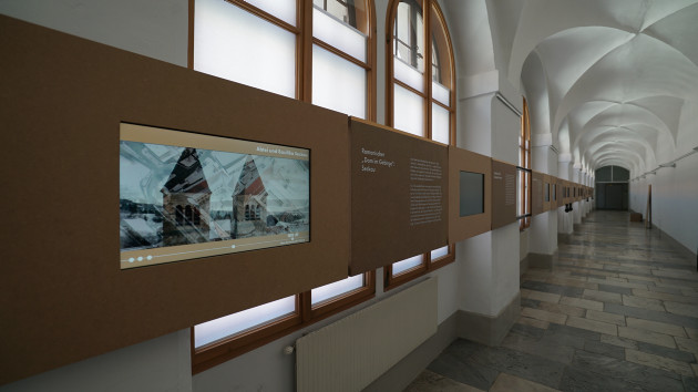 Durch die Gänge im ersten Stock des ehemaligen Jesuitenkollegs, das in seiner klaren Architektur deutlicher als anderswo sichtbar wird, zog sich in der Ausstellung eine multimediale kunsthistorische Zeitleiste durch die Epochen. Eine Reihe von im Winter 2017/2018 vom Autor gedrehten Videominiaturen gibt einen Einblick in eine über 800-jährige Sakralkunst. Einzigartige Sakralbauten, Wandmalereien und Altäre, Kreuze werden gezeigt und erzählt– von der Romanik bis zur Gegenwart.