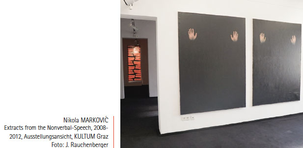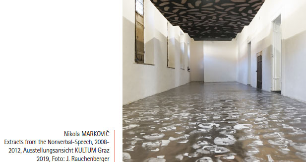 Im Südkorridor „versperrt“ eine Installation den gewöhnlichen Zugang: Wer zu den eindrucksvollen Bildern aus der Serie „Aspects from a Nonverbal Speech“ will, muss über Köpfe gehen... Und sich in der Folge ducken, denn dasselbe passiert auch jedem Besucher, ein Meer von Füßen erscheint an der Decke. Ein zwiespältiges Entrèe, das nicht nur tief in die serbische, sondern natürlich auch in unser aller Gesellschaft blicken lässt. Wir trampeln auf Menschen, und sie trampeln auf uns. Wohin gehören wir? Die Arbeit berührt offensichtlich auch das politisch derzeit so missbrauchte Migrationsthema – und ordnet die Rolle des Trampelns mittlerweile ziemlich deutlich zu.