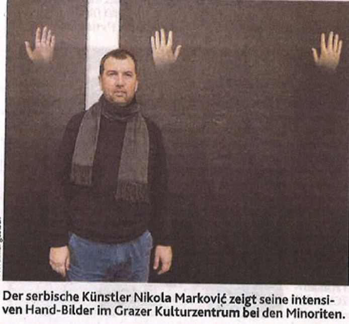 Am Ende sind in den vier Galerieräumen famos gemalte Hände bzw. Finger zu sehen. Sie scheinen buchstäblich aus der Tiefe des Raumes zu erscheinen. Finger aus Händen unterschiedlicher Hautfarbe geben sich die Hand. Andere wiederum sind aufgetürmt und wachsen in den schwarzen Himmel. Dann wiederum erscheint nur eine Hand aus der schwarzen Tiefe, deren Fingerspitzen zu sehen sind. Und noch ein anderes Mal sind zwei hochgestreckte Hände in Vorder- und Rückenansicht zu sehen. Ihr gegenüber applaudieren einmal Hände in der Masse und einmal ganz allein: Der Untertitel des letzten Bildes lautet: „So this is, how freedom dies – with a thunderous applause“. Gesten, Blicke, Energien sind es, die wirklich töten, verstören, froh machen oder vielleicht sogar trösten können. Die „Auszüge aus der nonverbalen Sprache“ zeigen Hände und Füße, die aus dem Schwarz des Hintergrundes buchstäblich erscheinen. Aber separierte Hände sind nicht nur als Masse zu sehen, sondern auch als Einzelhände. Das Ausmaß an Dunkelheit gemahnt mitunter an ein Kreuz.