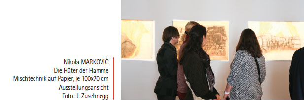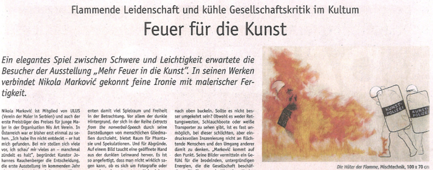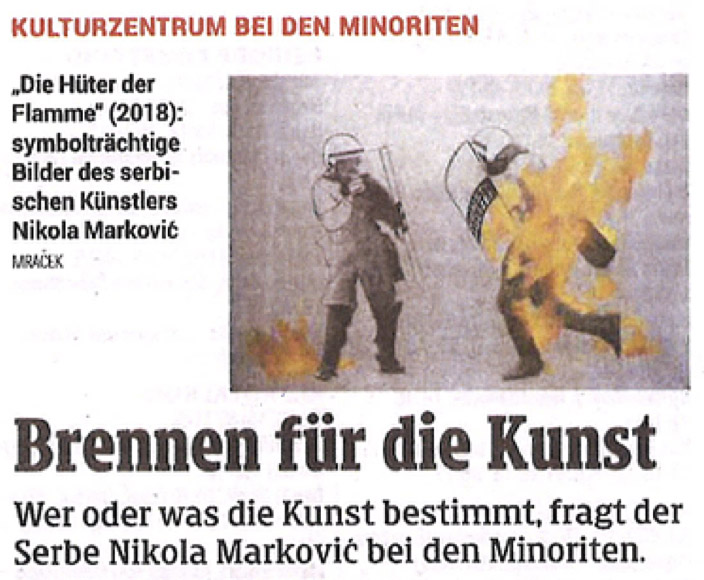 Die „Kunstpolizei“ – die auf einer Serie von Zeichnungen im Westflügel zu sehen ist – versucht das Feuer, das in der Gesellschaft nicht nur als Inspiration, sondern auch als latente Gewalt zu lodern beginnt, zu löschen. Sie ist bewusst in deutscher Sprache benannt, weil es im Deutschen „härter klingt“, wie Markovic betont. Das ist zum einen eine scharfe Kritik eines Künstlers aus einem von Krisen gebeutelten Land an den Regulierungsszenarien des Kunstmarkts. Das, was an der Kunst verhandelt wird, gilt aber ebenso für die Gesellschaft und ihren Regularien, das jeweilige Feuer im Zaum zu halten oder zu löschen – als Bedrohung, aber auch als „inneres Feuer“. Den „Hütern der Flamme“ ist demnach eine weitere Serie gewidmet – nicht zuletzt in Form von bravourösen Pastell-Zeichnungen verbrennender Holzscheiter, die freilich auch an die Kälte ihrer Entstehung denken lässt.