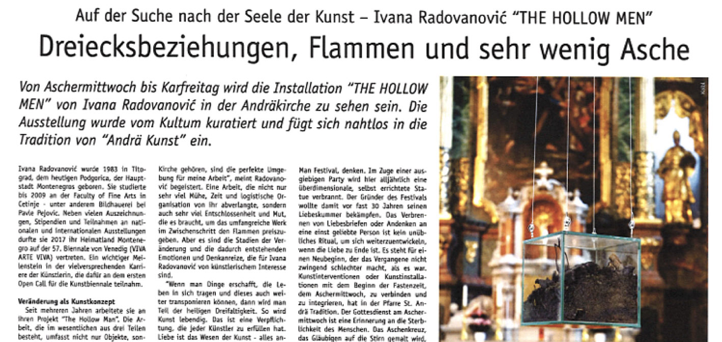 Das gesamte Gedicht von Eliot über die Eitelkeit, den Popanz, die Macht und den Untergang bedeckt als Fastentuchstreifen die Hochaltarwand von St. Andrä. Mit dem Konzept dieser Arbeit vertrat Ivana Radovanovic Montenegro auf der letzten, der 57. Biennale von Venedig „VIVA ARTE VIVA“.