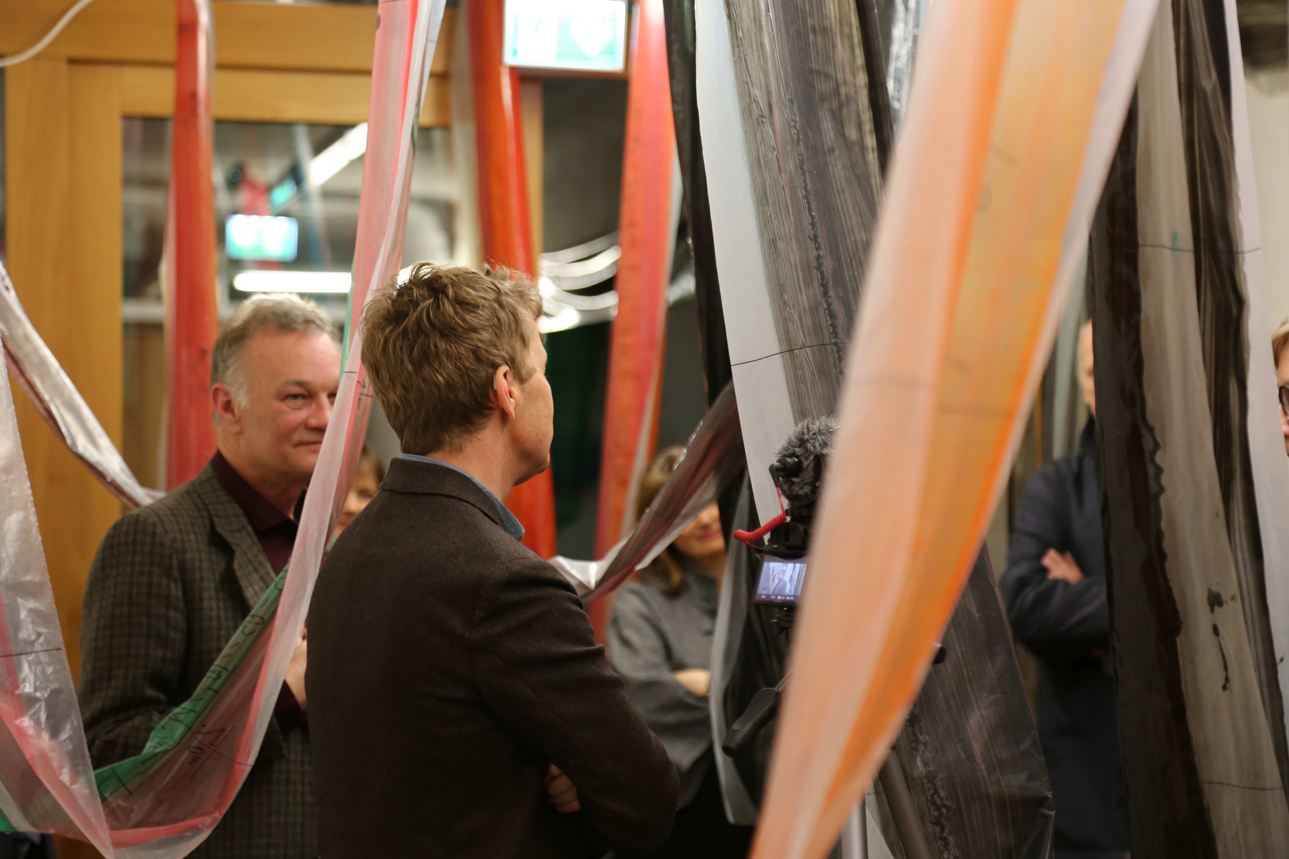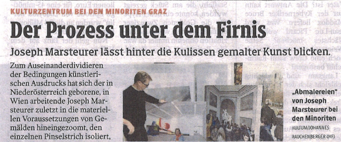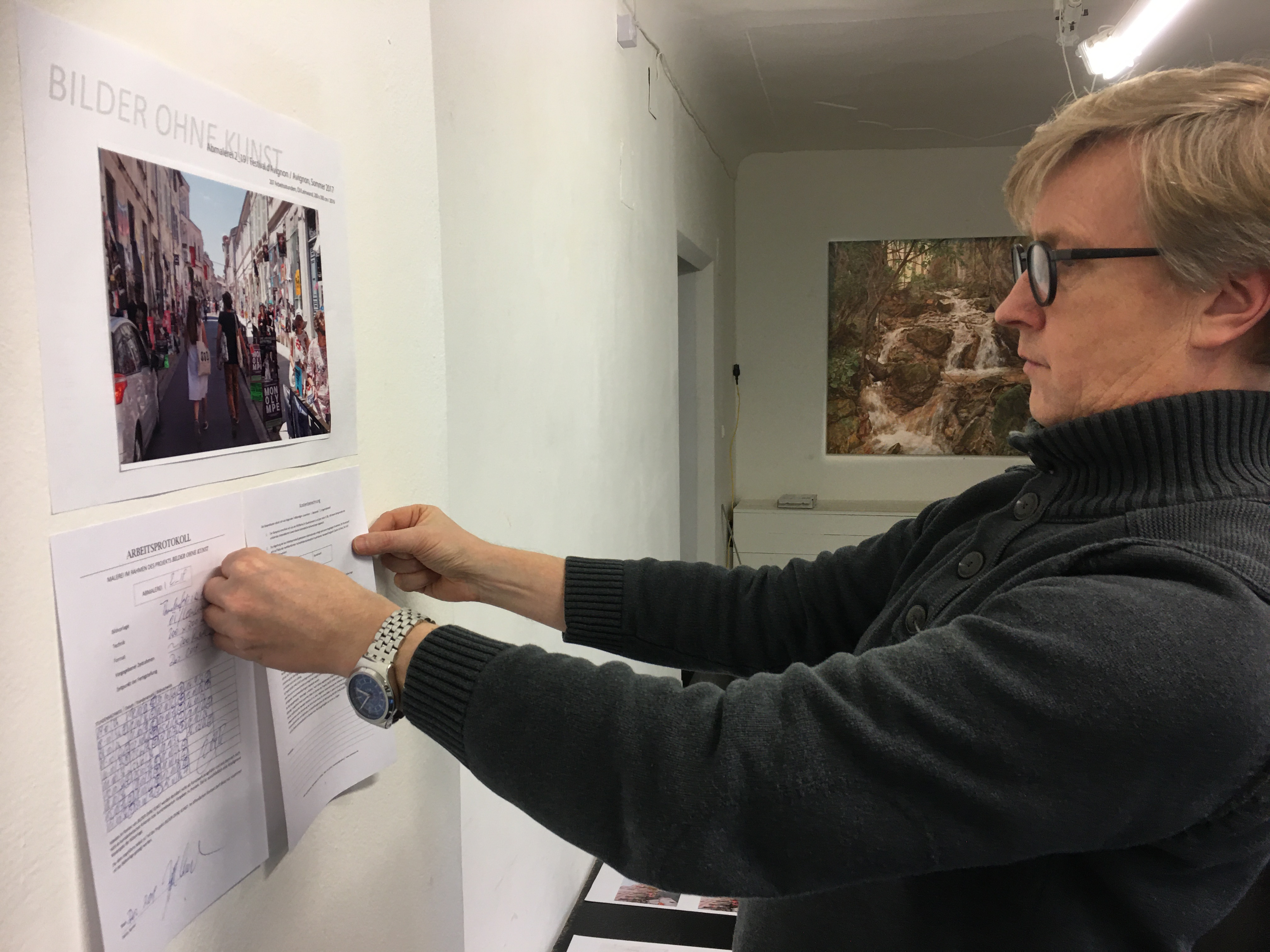 Joseph Marsteurer geht es bei BILDER oder KUNST vor allem um Zwischenräume. In dieser Arbeit (der Abmalerei) „grenze ich vielmehr ab, es sind eben nicht die ästhetischen Räume, die in der anderen Arbeit, die ich sonst mache, ständig zum Zentrum werden.“ Marsteurer schließt hier etwas – seine Malerei als Kunst – aus: Indem er aber ausschließt, grenzt er den Begriff ein. „Dazu muss es aber relativ kunstnah sein für eine breite Betrachterschaft. Mit diesem Ausschlussverfahren ist der Fokus, wo sich Kunst-Ästhetisches abspielt, enger, etwas exakter.“
