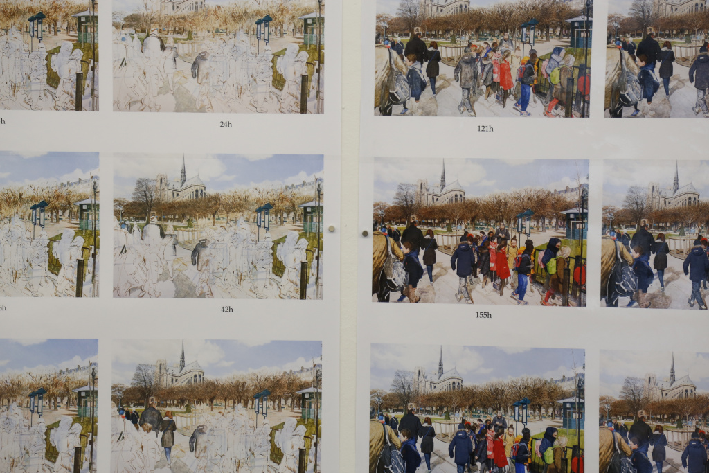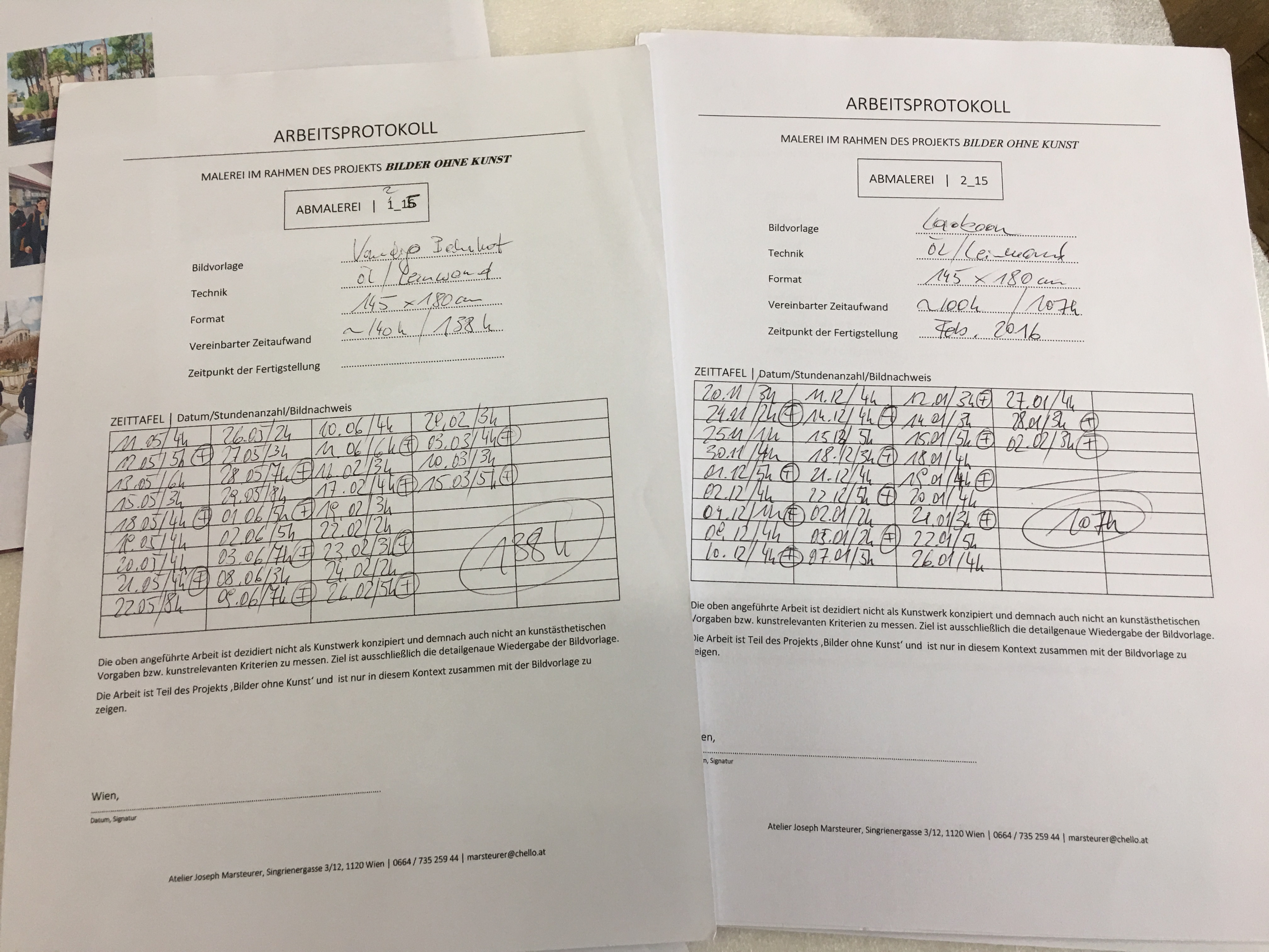 Der Arbeitsprozess bei der „Abmalerei“ von Joseph Marsteurer wird genau dokumentiert: 200 Stunden Jahreshöchstarbeitszeit dürfen bei der Erstellung des Bildes nach einer fotografischen Vorlage eben nicht unterschritten werden. Die Optimierung läuft nach Plan.