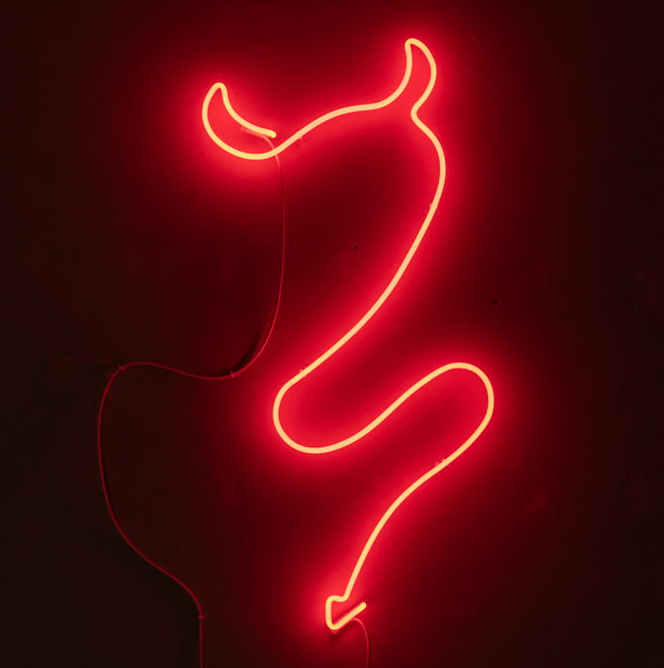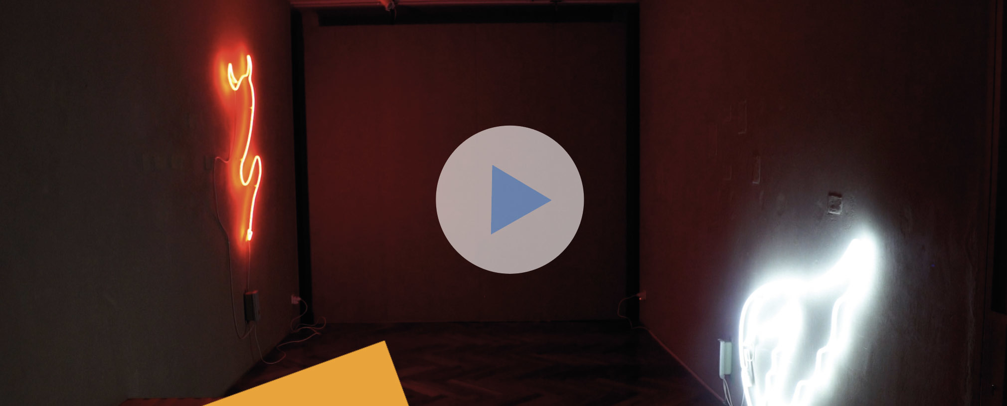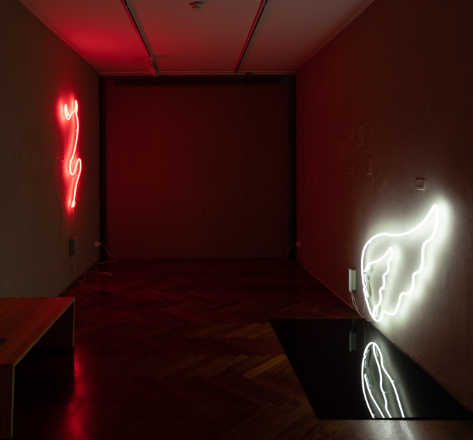 Neon tube drawings of an angel's wing and a devil's face highlight the primordial principles of good and bad, which the snake in the garden of paradise had once promised to recognize and differentiate in bright advertising style. But the title is: Darkened by the Spirit. Or thinking —"OBSCURED BY THE MIND". The silhouette of the emblems also suggests remembering these original principles in times of alternative facts.
