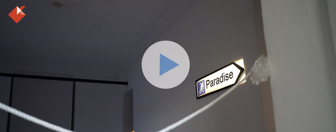 The transition to the second wing of the exhibition, in which an answer to the questions raised in the closed paradise was drafted, was bridged by two works, which at the same time also formed the first works that the visitors encountered during a real visit, which was only possible for a few days. “We, the poor of this world”, a video by Valentin Stefanoff, and “enjoyment” by ninavale in the form of individual illuminated letters, stored in cardboard boxes.
