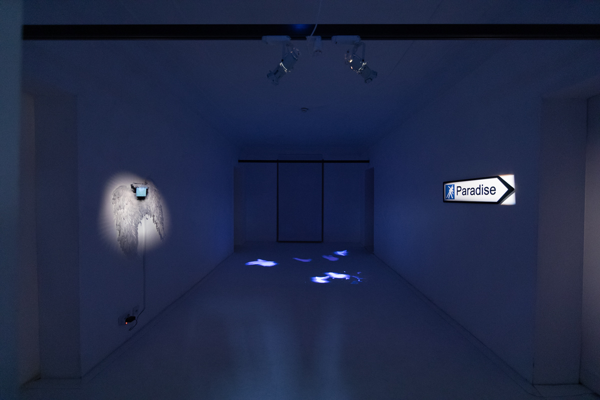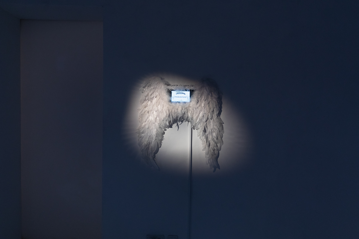 ninavale: Paradise is temporarily closed, 2020, Rauminstallation: VIdeo, 2 Akustikräume, Engelsflügel, Monitor, Verkehrsschild. KULTUMdepot Graz, aus: ninavale: Paradise is temporarily closed (2020/21)