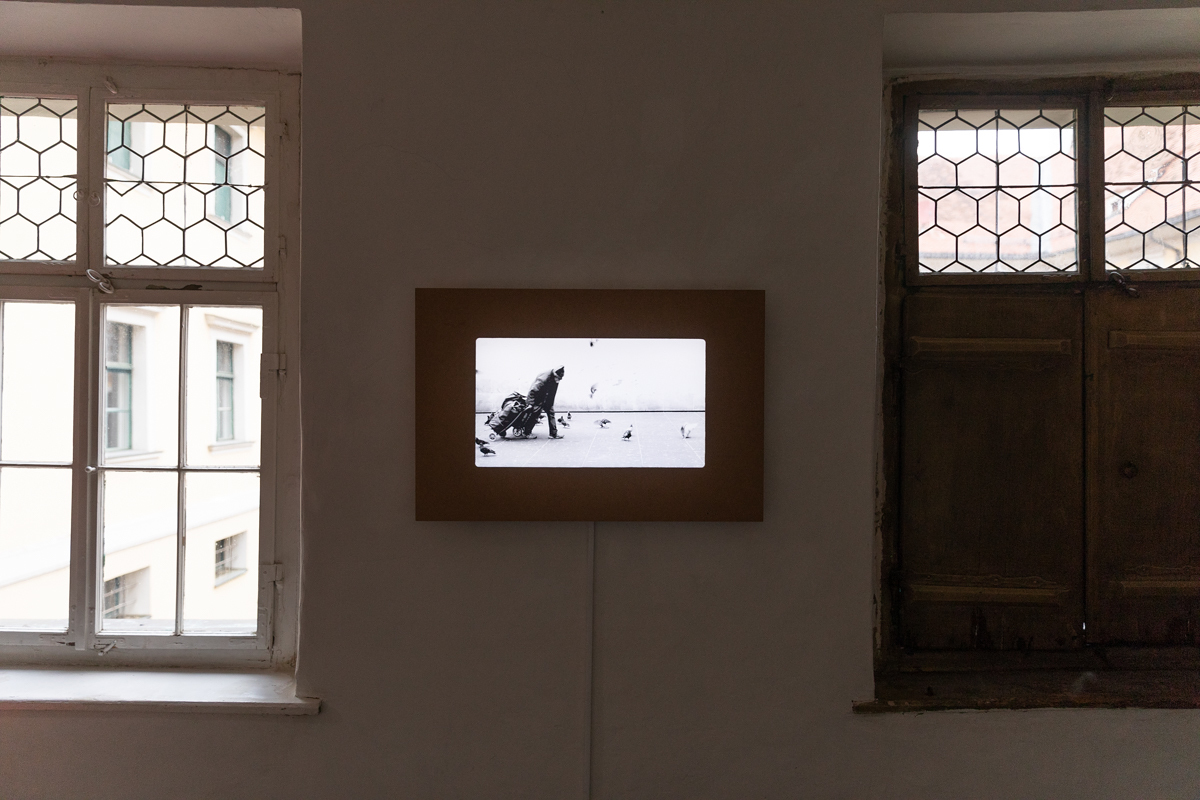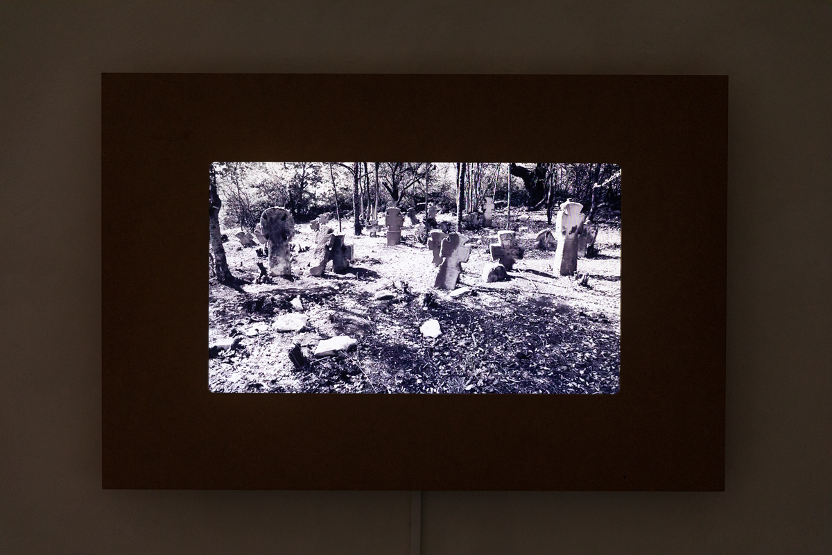 At the time when this exhibition was taking place, this narrative was like a concentrated commentary on the now. Only two scenes determine the five-minute video, in which individual sentences with very different meanings, times and authors are blended using a bold sampling method. A homeless man feeding the pigeons—it is the same person (in Paris) who also directed the pigeons in the first exhibition room—and a dilapidated Eastern European cemetery with Glagolitic characters.