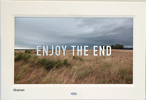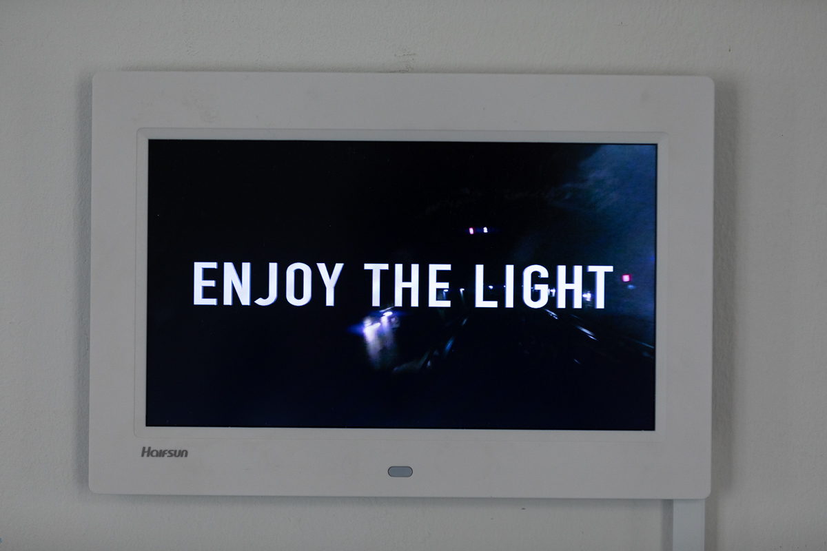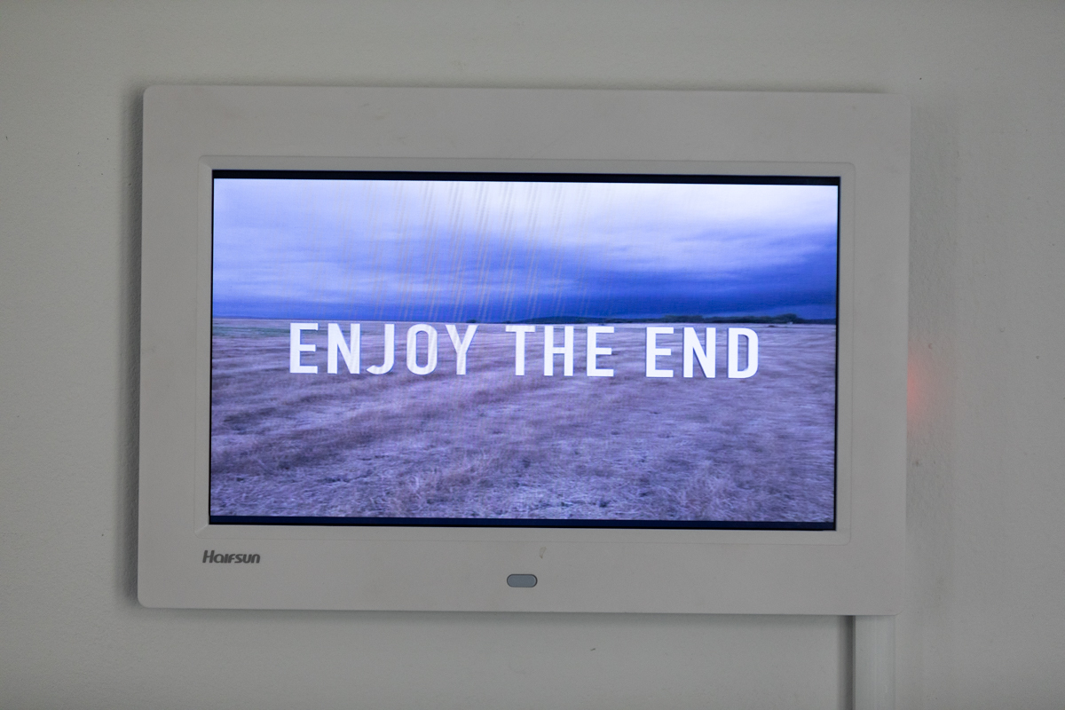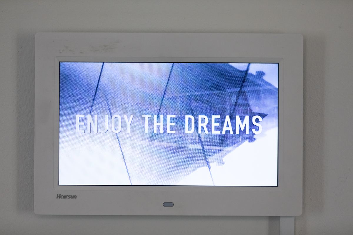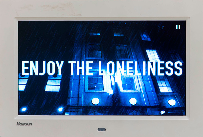 What, then, if you do not want to and cannot follow the temptations of ninavale? The request on the small monitors along the corridor with the telescope and the digitally printed artist couple expressed restraint, stoic calm but also insolence, irony and cynicism at the same time. “ENJOY THE SOCIETY! ENJOY THE DREAMS! ENJOY THE LIGHT! ENJOY THE LIBERTY! ENJOY THE END! ENJOY THE LONELINESS! ENJOY THE ANONYMITY”, read the small monitors, on which various landscapes with flocks of sheep, the Paris metro at night, house facades in the rain or wafts of mist were depicted in film miniatures.