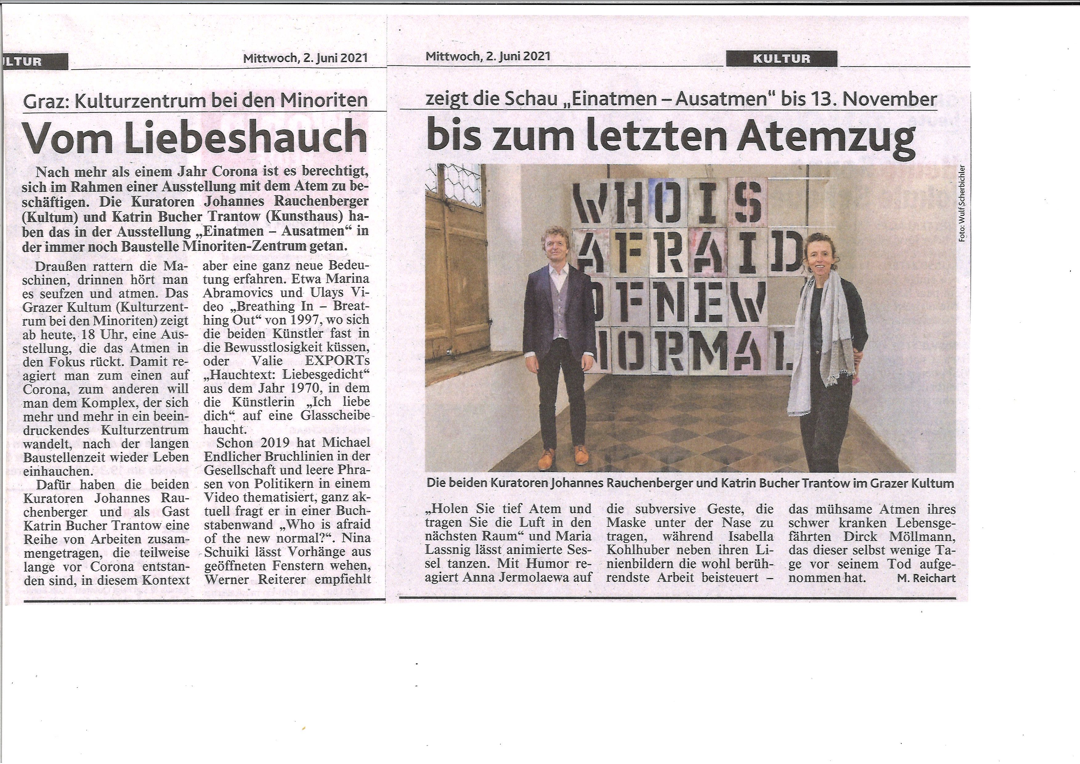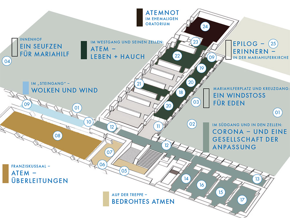 Mariahilferplatz und Kreuzgang, Innenhof und Treppen, das ehemalige Refektorium, frühere Klosterzellen, das ehemalige Oratorium, die Mariahilferkirche: Historisch schwer atmende Orte des Grazer Minoritenklosters werden zu Räumen, über Atem nachzudenken. Seufzen und Atemnot, Windstoß und Wolken, Atem und Atemlosigkeit, Atem, Liebe, Leben und Hauch. Letzter Atem und ein Wehen von Trost: So weit spannen sich die Felder auf, mit denen Kunst nach diesem besonderen Jahr der Atemnot und dem besonderen Jahr der Erneuerung des Minoritenklosters dem Publikum nun entgegen kommt.