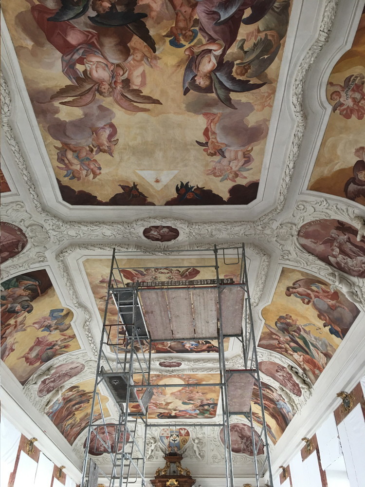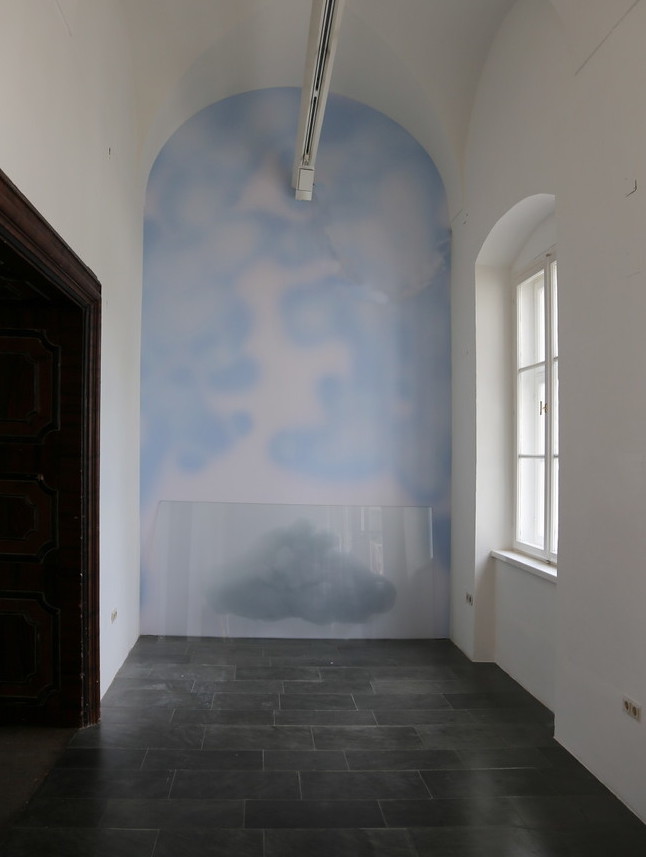 Christiane Peschek tapezierte (in der ersten Phase der Ausstellung im Sommer) einen Himmel auf die für den ersten Teil der Ausstellung errichtete Trennwand zum dahinterliegenden barocken Minoritensaal, dessen Inneres und dessen „Umfeld“ nicht nur umfassend saniert wurden, sondern auch dessen paradiesische „Himmelsbilder“, von jeder Verunreinigung befreit, bald für alle sichtbar in hellem Glanz erstrahlen werden.