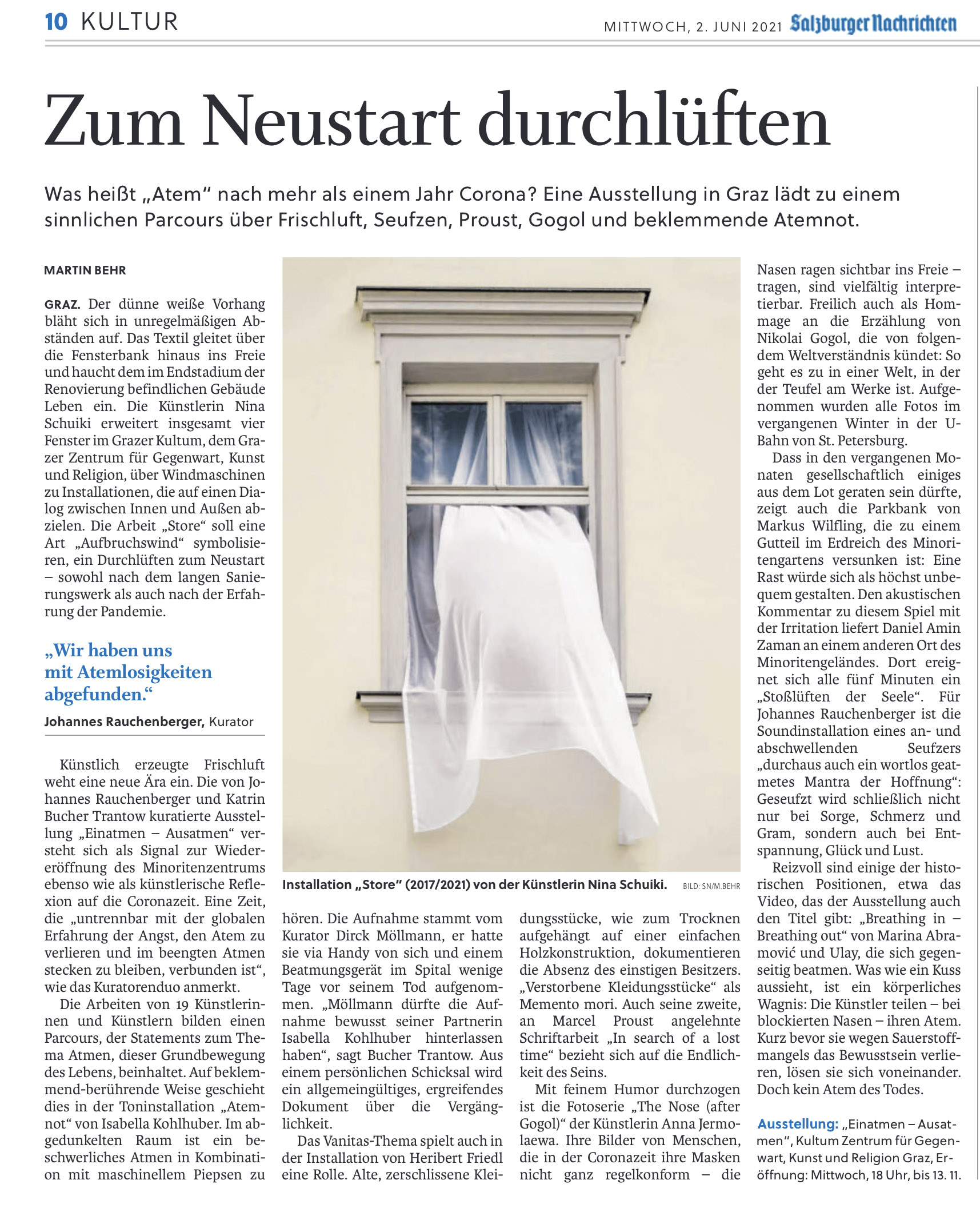 Nur ganz wenige Tage bevor die Welt im Vorjahr jäh aufgrund von COVID-19 einen Stillstand ausrief, wurde die erste Mauer bei den Minoriten durchgebrochen. Es folgte das Schweigen des ersten Lockdowns, völlig einsame Begegnungen im Kreuzgang im durchbrochenen Homeoffice, gefolgt von einer stillen Paradiesesausstellung im alten Kloster. Fast zeitgleich durchbrach das Dröhnen der Pressluftbohrer den Boden des franziskanischen Kreuzgangs. Allein der Kirschbaum blühte in gleichbleibender Pracht wie jedes Jahr. Es folgten Bagger, tiefe Löcher, Dreck, Hitze, Sturm – und Monate der Kälte, in denen der schöne Kreuzgang mit Plastikplanen verhüllt wurde. Und nun: das leise Wehen eines weißen Vorhangs aus den alten Fenstern. Die in Berlin lebende, aus der Steiermark stammende Künstlerin Nina Schuiki haucht mit Store (Windstoß) dem Gebäude Leben ein.