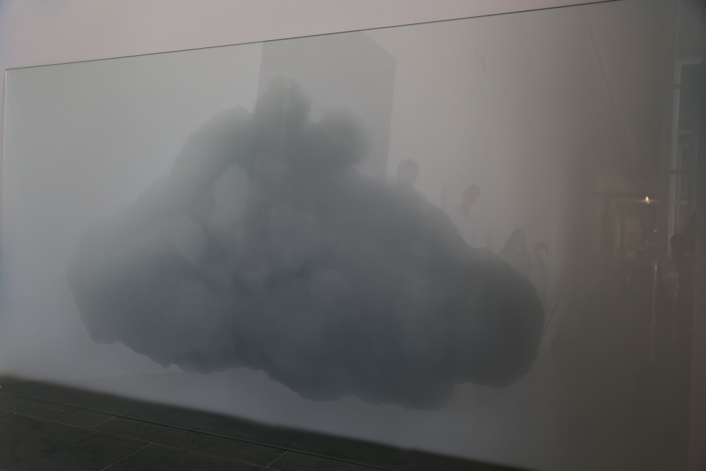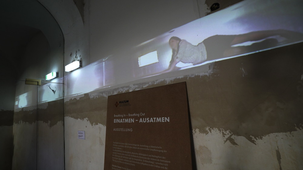 Sie verleiht ihm schon von weitem sichtbar einen eigenen Atem und verweist auf sein Innenleben. Im Innern sorgen Ventilatoren für die Bewegung des leichten Textils und streifen die vorbeigehenden BesucherInnen mit einem spürbaren Lufthauch. Die Geste schafft eine Verbindung von Innen und Außen, von Objekt und Subjekt. Sie ist ein fast feierlicher Beginn für eine Ausstellung, die nicht nur ein Ende eines Renovierungsprojekts „einwehen“ soll, sondern auch eine gedankliche Nachschau auf dessen Renovierungszeit, die untrennbar mit der globalen Erfahrung der Angst, den Atem zu verlieren und im beengten Atmen stecken zu bleiben, verbunden ist.