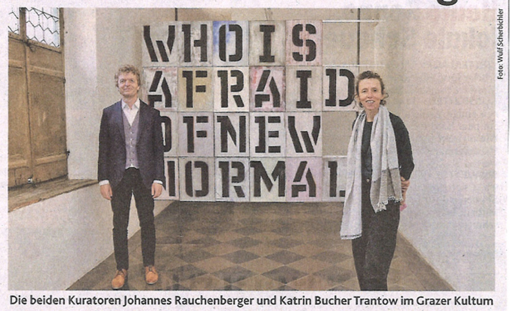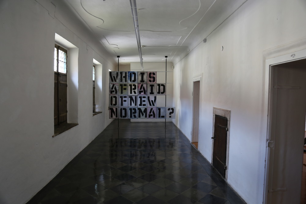 Dominierend ist Michael Endlichers jüngstes Schriftbild am Ende des Ganges: WHOISAFRAIDOFNEWNORMAL?