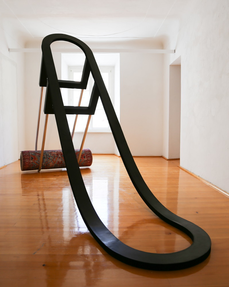 Julie Haywards neue Skulptur – unmittelbar zur Ausstellungseröffnung fertig geworden – verdankt sich auch den Erfahrungen im Lockdown 2020/21. Mit der Umrissform einer leeren Rutsche versetzt das schwarze Objekt Out of Control die Ausstellung in einen seltsam bedrohlichen Spielplatz. Die Bahn der Rutsche fehlt, dem freudigen Tun ist buchstäblich der Boden entzogen. Was folgt, wäre der freie Fall. Ob der eingerollte Teppich augenzwinkernd diesen in ein sanftes Fliegen über den Wolken übersetzt, oder ob er einfach nur zufällige Stütze fürs allzu leichte Kippgerät ist, bleibt dahingestellt.