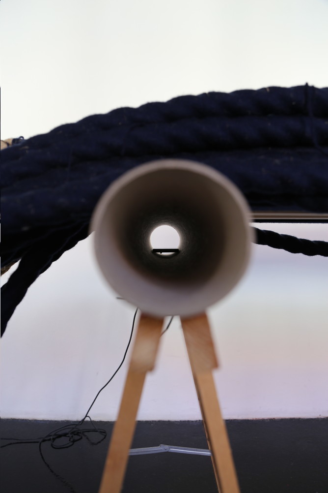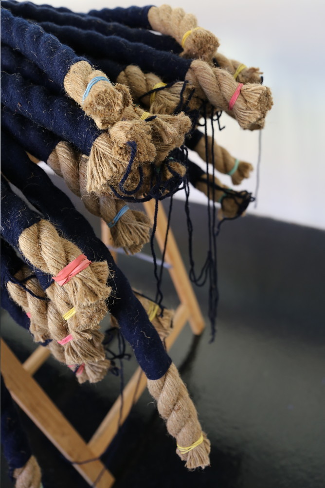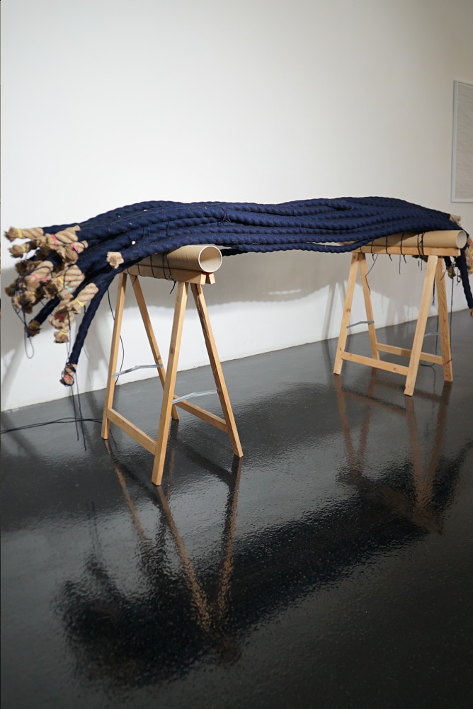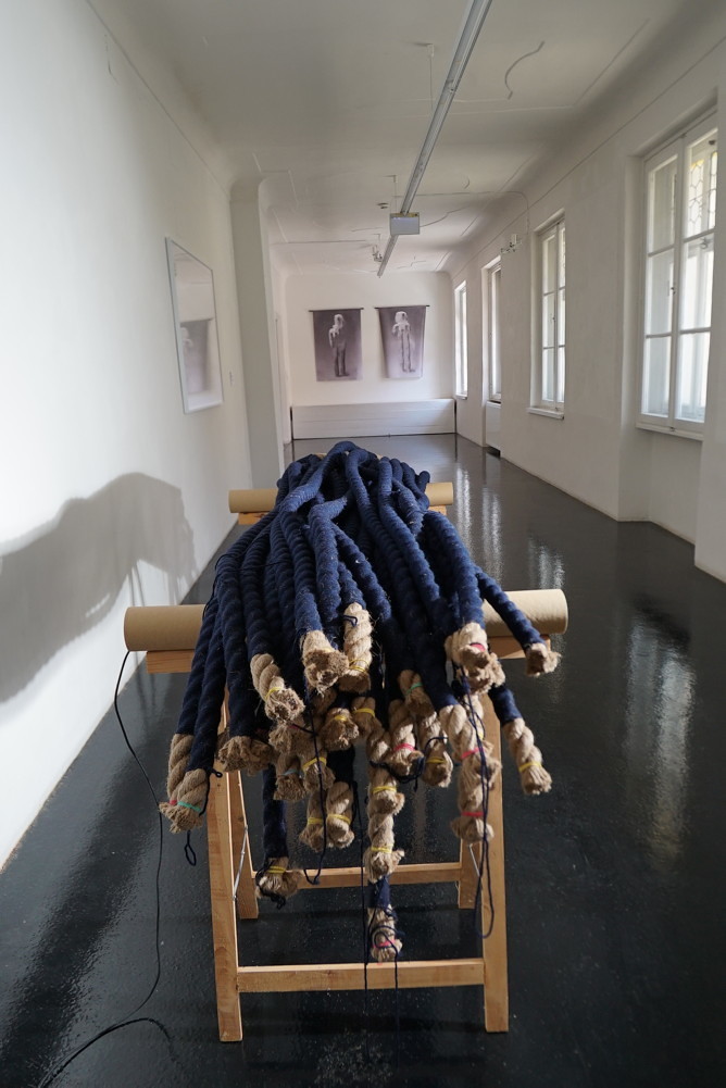 Skulptural steht im Westgang eine Ansammlung von handgewickelten, dicken Seilen, die straff da liegen – als ob Ihnen eine besondere Anspannung gegeben wäre. Daniel Amin Zaman hat die einzelnen Stränge, die an Taue von schweren Tankern erinnern, in mühevoller, ritueller Wiederholung über viele Wochen gewickelt, gedreht, angezogen und letztlich in einer ungefähren menschlichen Körperlänge in Form gebracht. Sie liegen aufgebahrt, auf einfachen Kartonröhren. Das Innere eines solchen Seils nennt man übrigens „Seele“. Aus den Kartonröhren dringen die Geräusche der vergangenen Arbeit. Ein Einatmen, ein Ausatmen – und eine kurze Stille – die Atempause. Sonst hört man nur das Geräusch des von Hand immer wieder stückweise in Rotation versetzten, innerhalb von Kartonrohren laufenden Seils, um das Millimeter für Millimeter der Faden mitternachtsblauer Wolle geführt wird und es umwickelt. Der Atem folgt dem Rhythmus der Handlung, die Handlung folgt dem Rhythmus des Atems – und hier verbinden sie sich nach Zaman „zu einem ritualisierten, ununterscheidbar künstlerischen wie kultischen Akt, der gezielt ins Leere geht“. Er ist eine „Leerformel“, der Handlungsrelikte ohne Signifikat schafft, ganz bewusst nicht mehr und nicht weniger ist (oder sein will) als sein Vollzug, eine Einübung in die Absichtslosigkeit und eines Handelns des Nicht-Handelns.